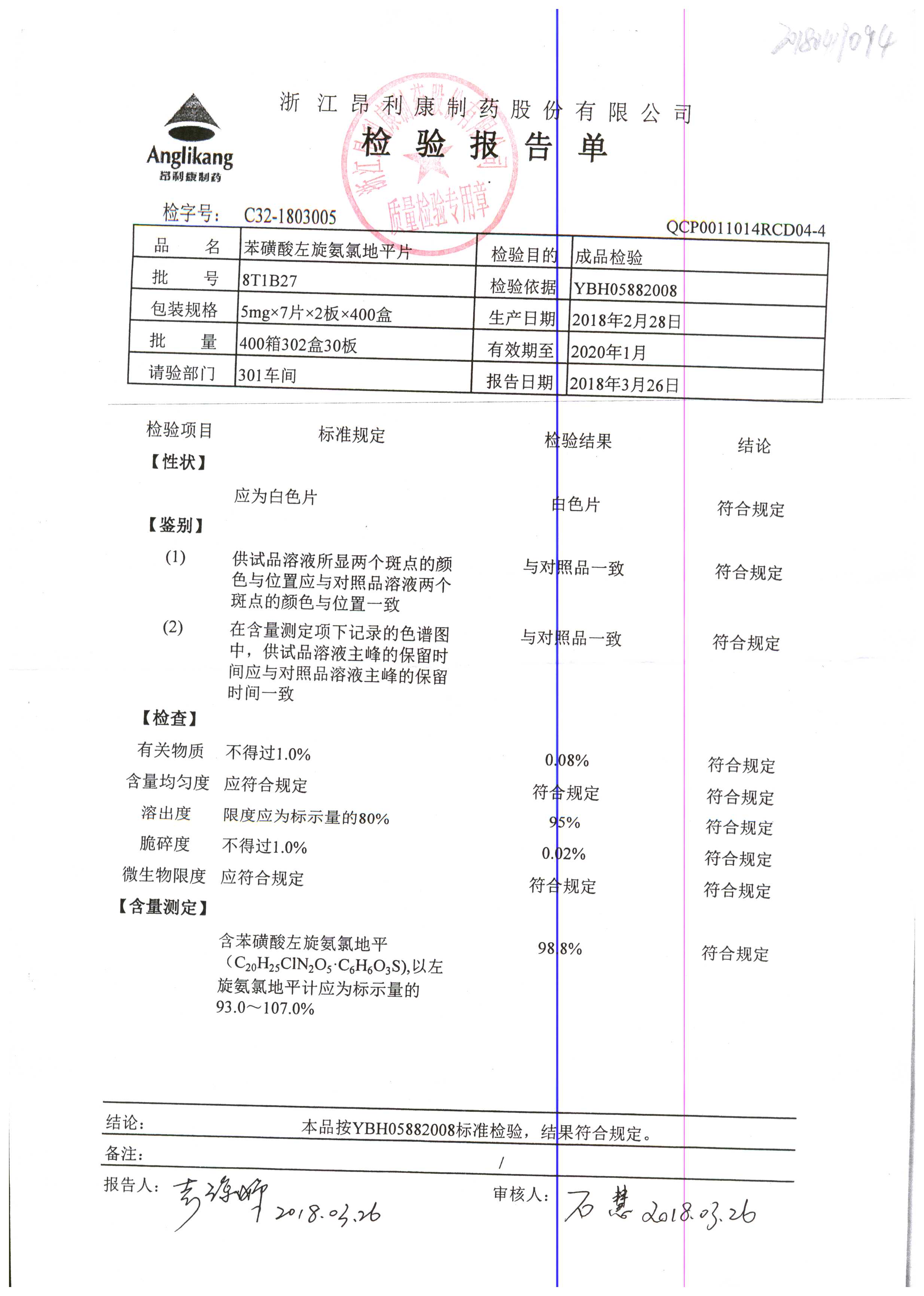 | 苯磺酸左旋氨氯地平片 | 2.5mg*14片 | 8T1B27 | 查看詳情 |