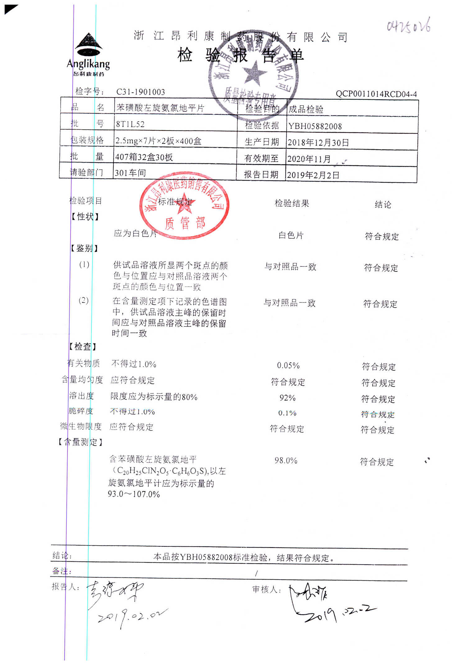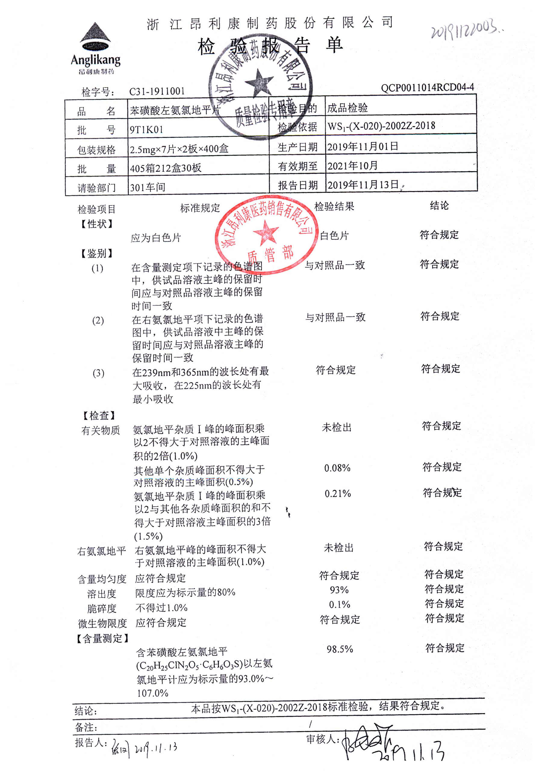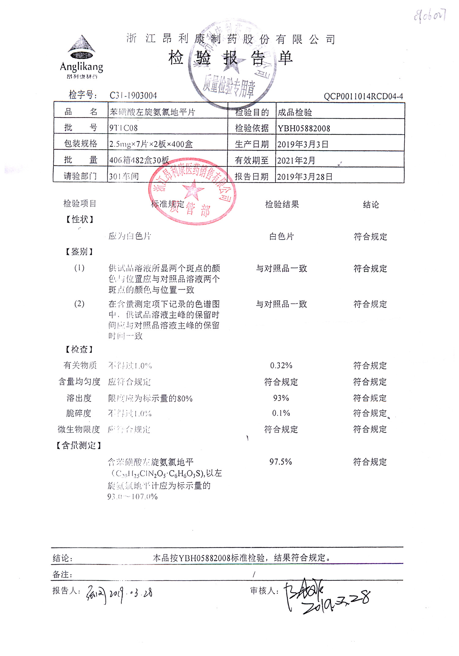 | 苯磺酸左旋氨氯地平片 | 2.5mg*14片 | 8T1L52 | 查看詳情 |