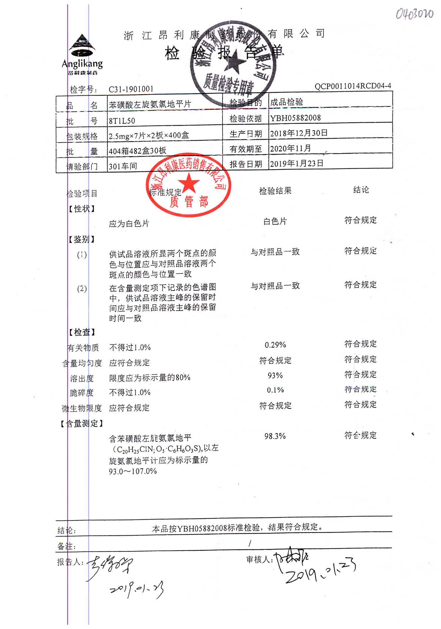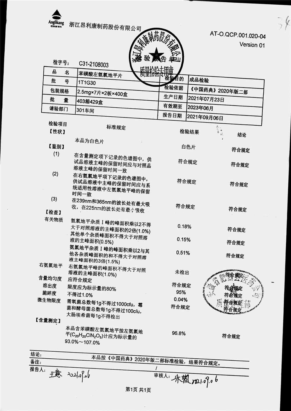 | 苯磺酸左旋氨氯地平片 | 2.5mg*14片 | 8T1B23 | 查看詳情 |