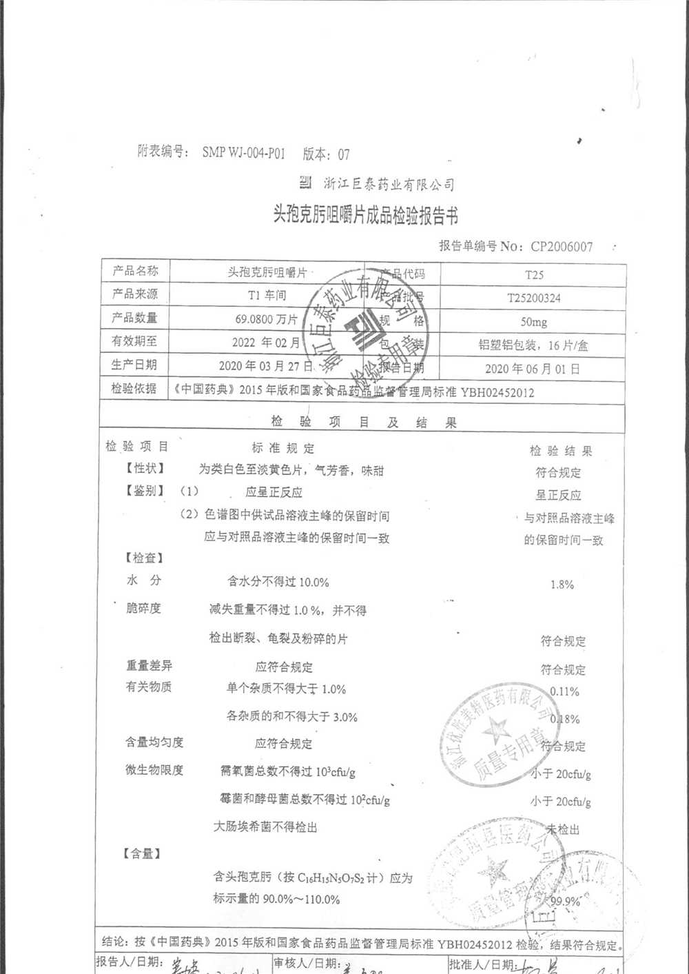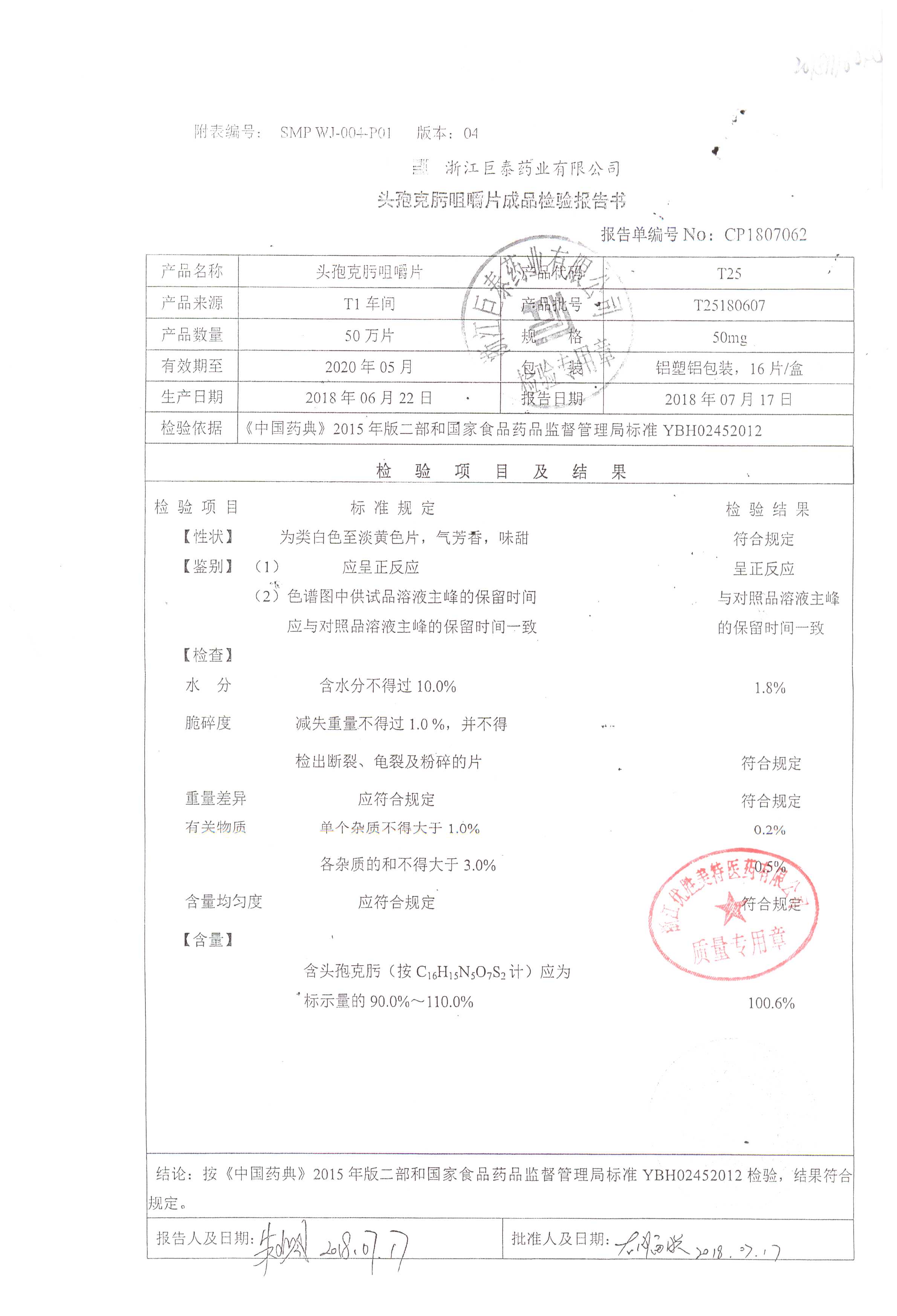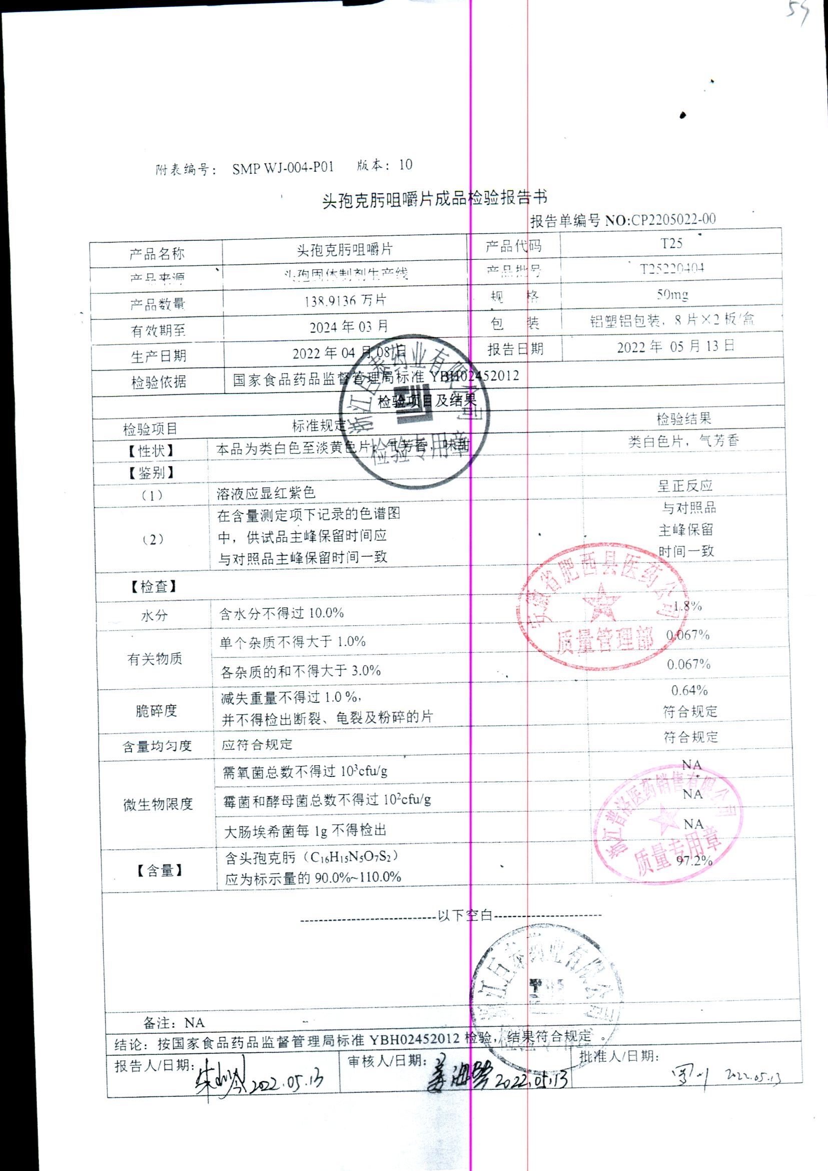 | 頭孢克肟咀嚼片 | 50mg*16s | T25220201/1 | 查看詳情 |