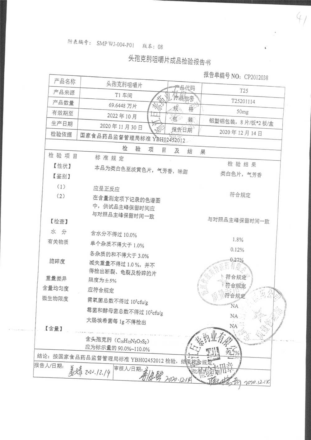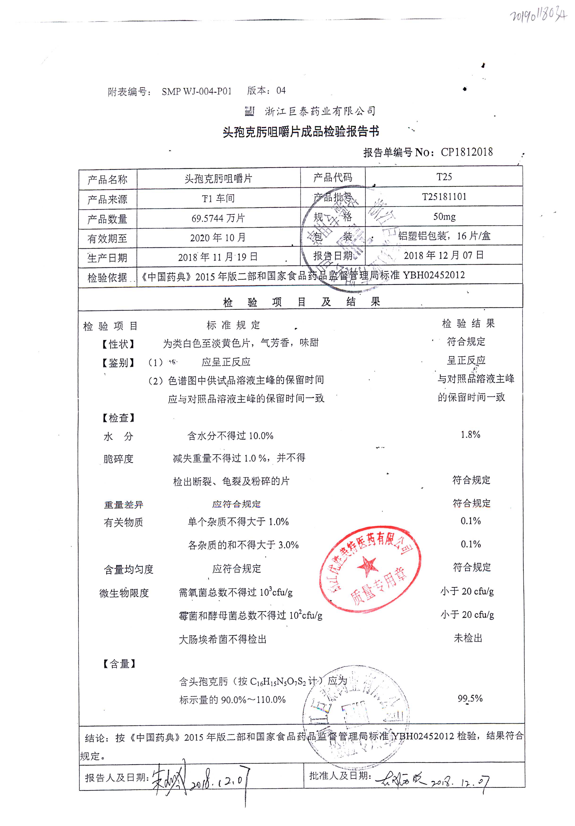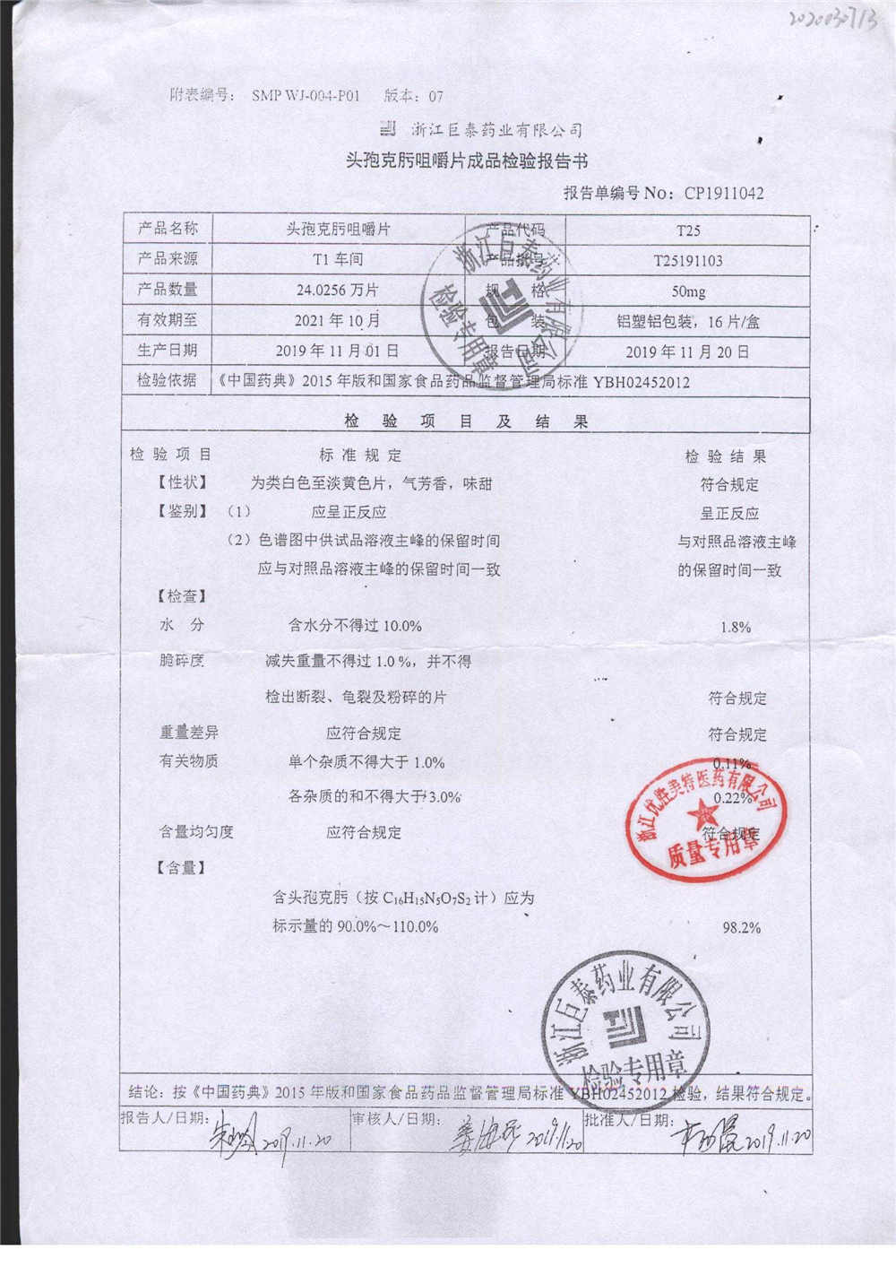 | 頭孢克肟咀嚼片 | 50mg*16s | T25201114 | 查看詳情 |