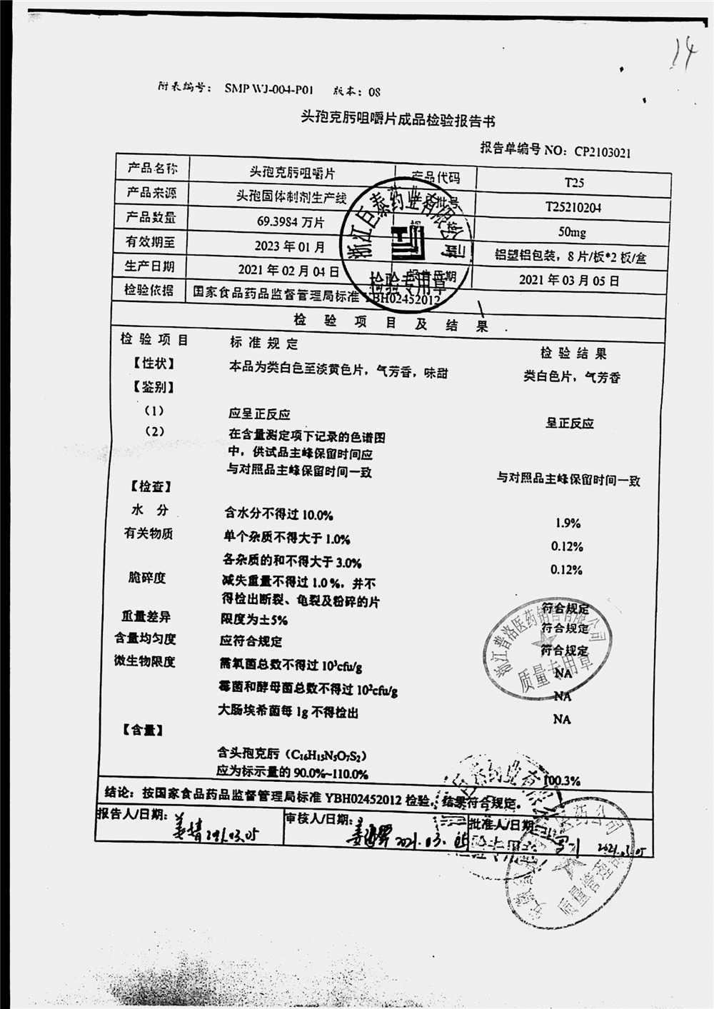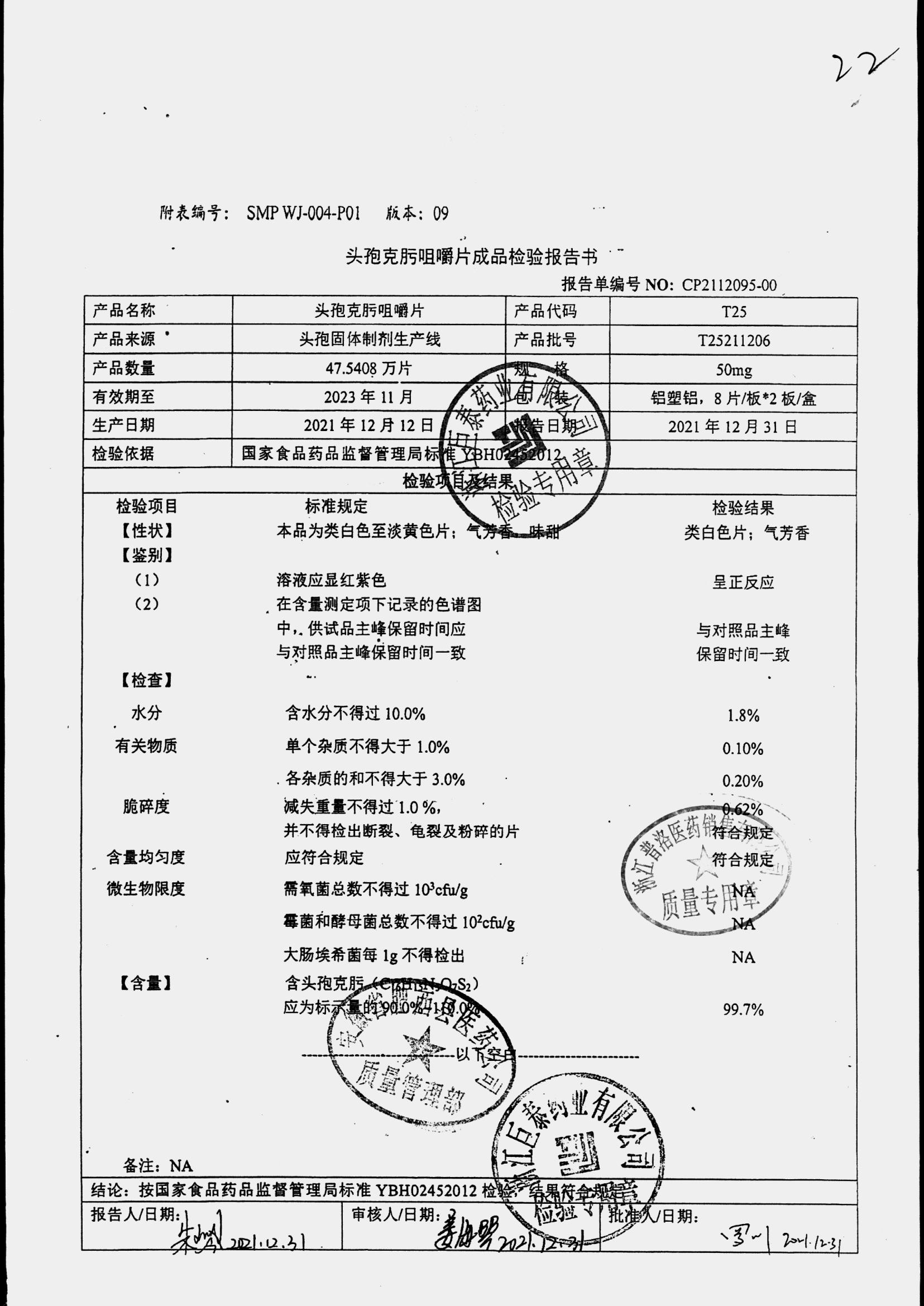 | 頭孢克肟咀嚼片 | 50mg*16s | T25210203 | 查看詳情 |