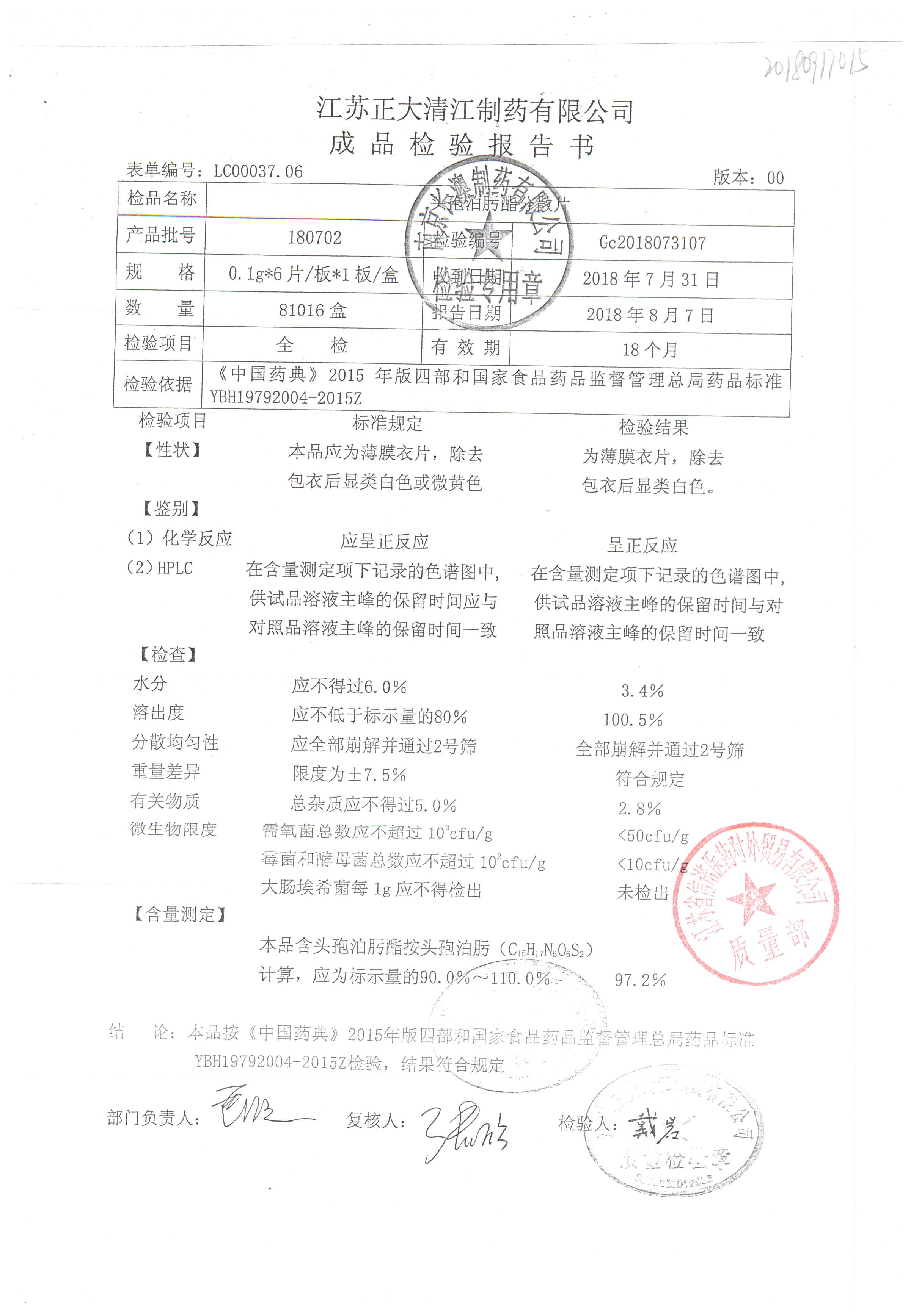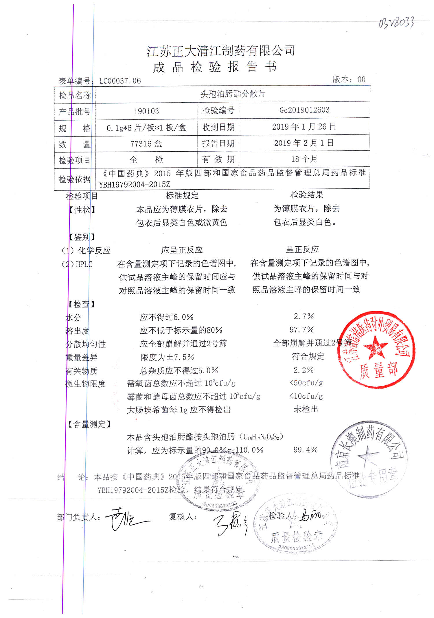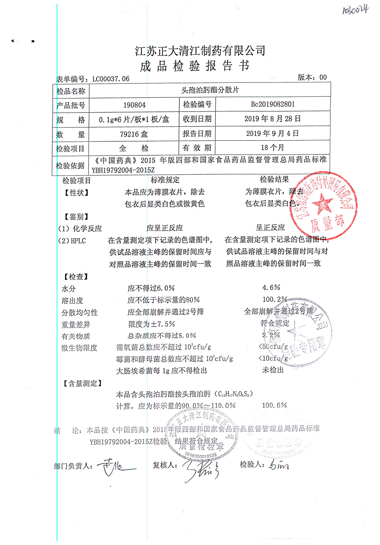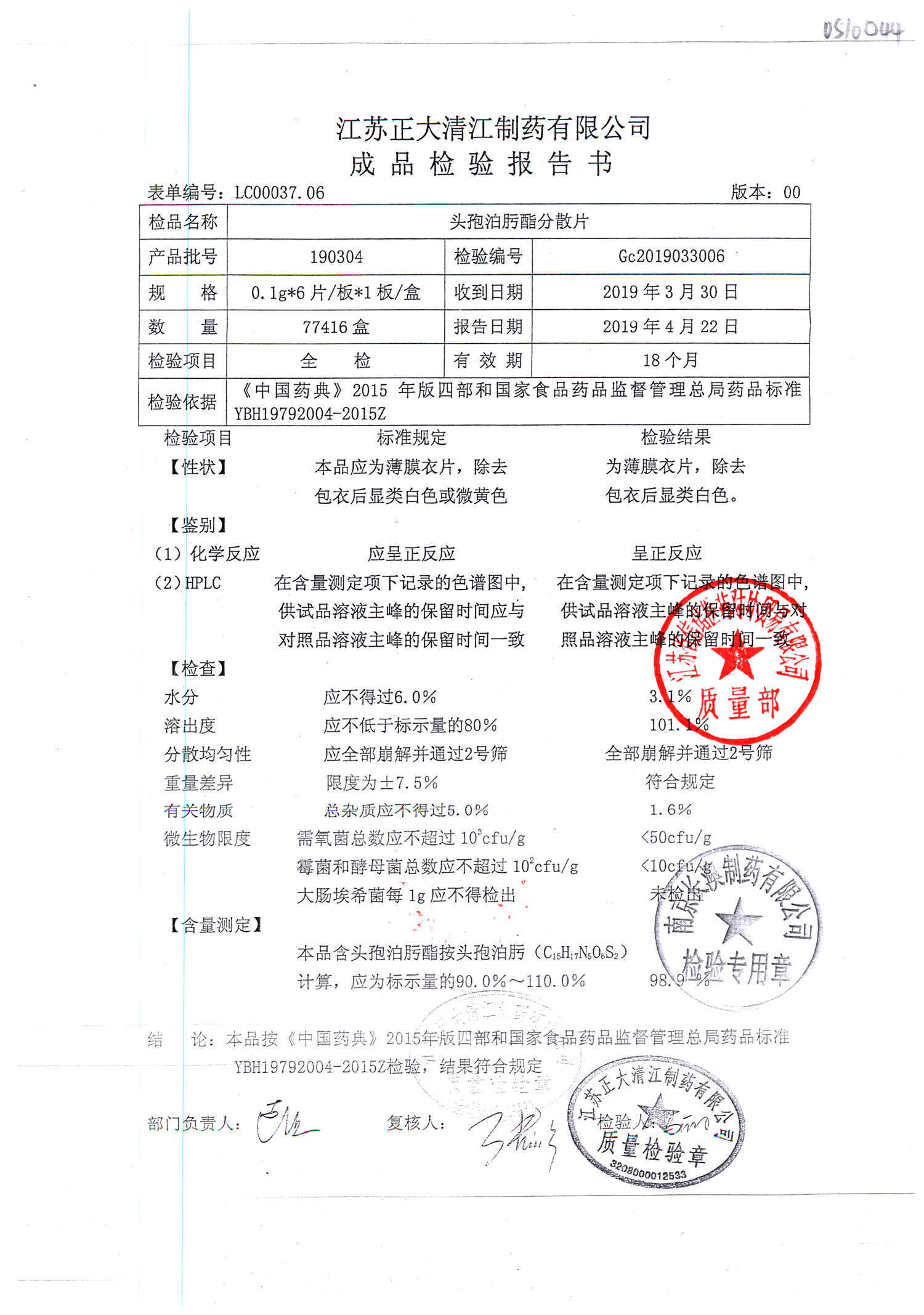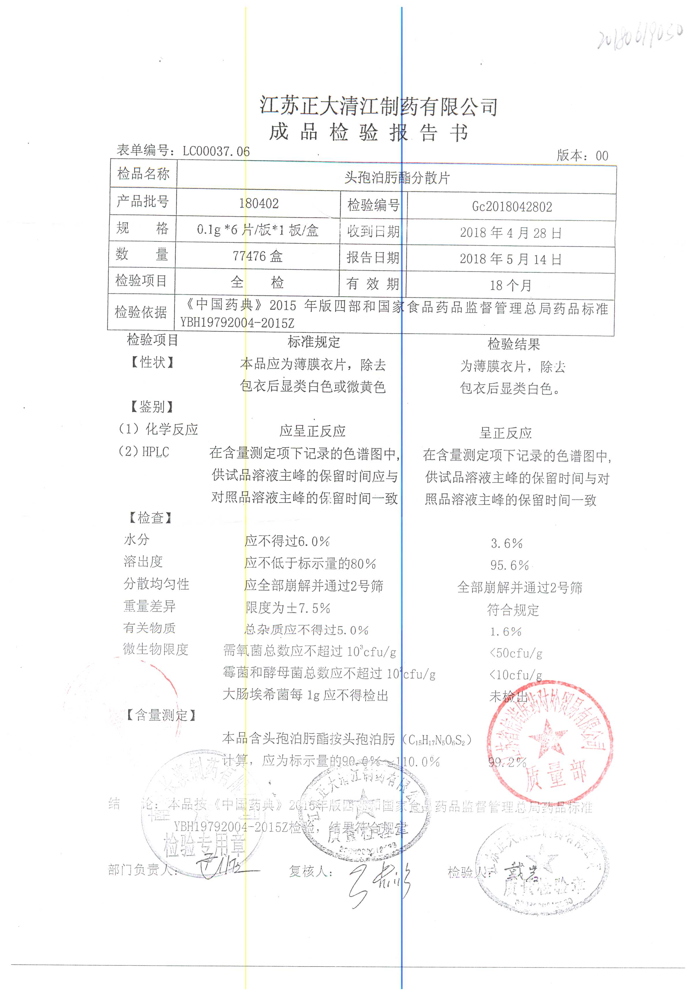 | 頭孢泊肟酯分散片 | 0.1g*6s | 180804 | 查看詳情 |