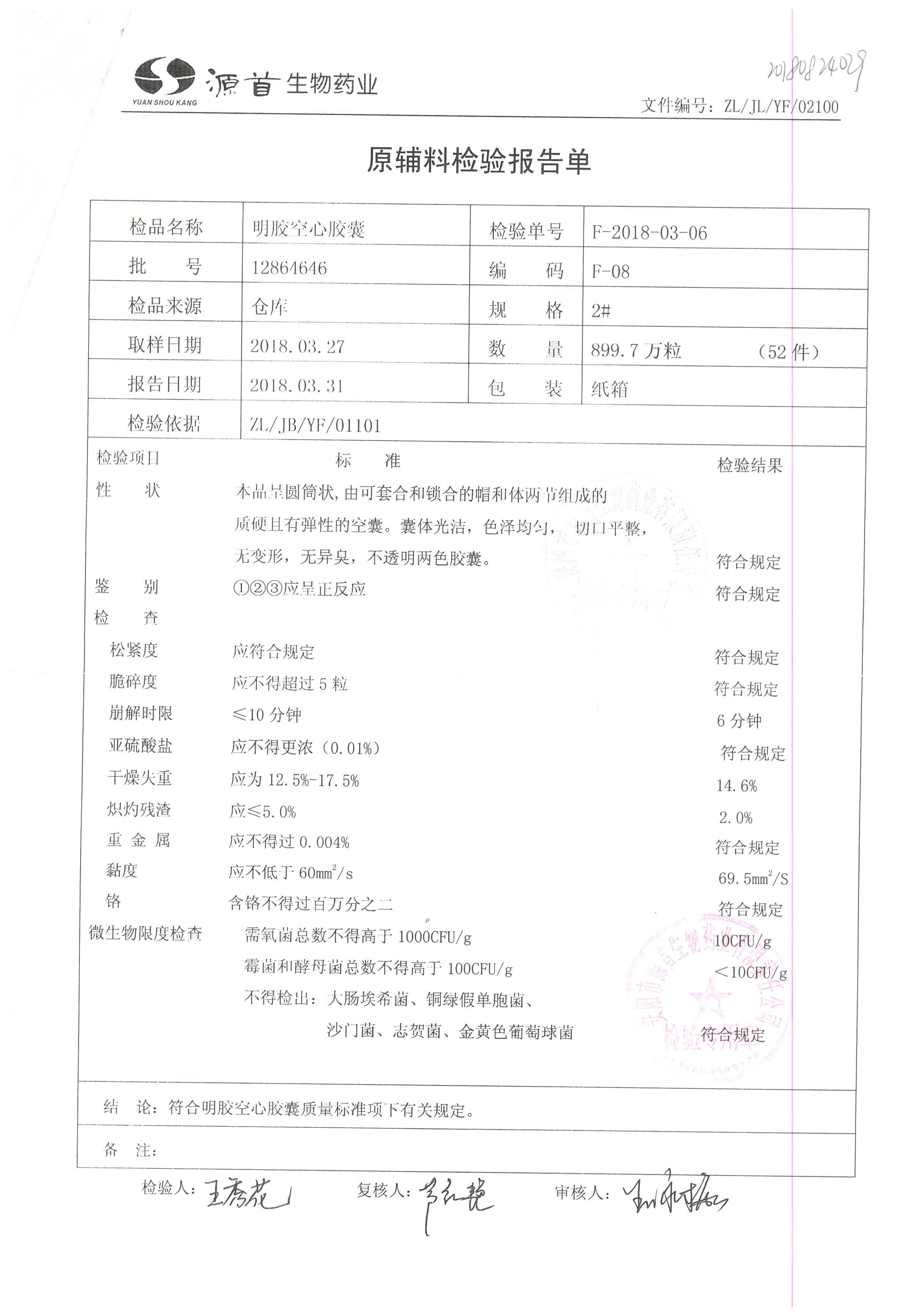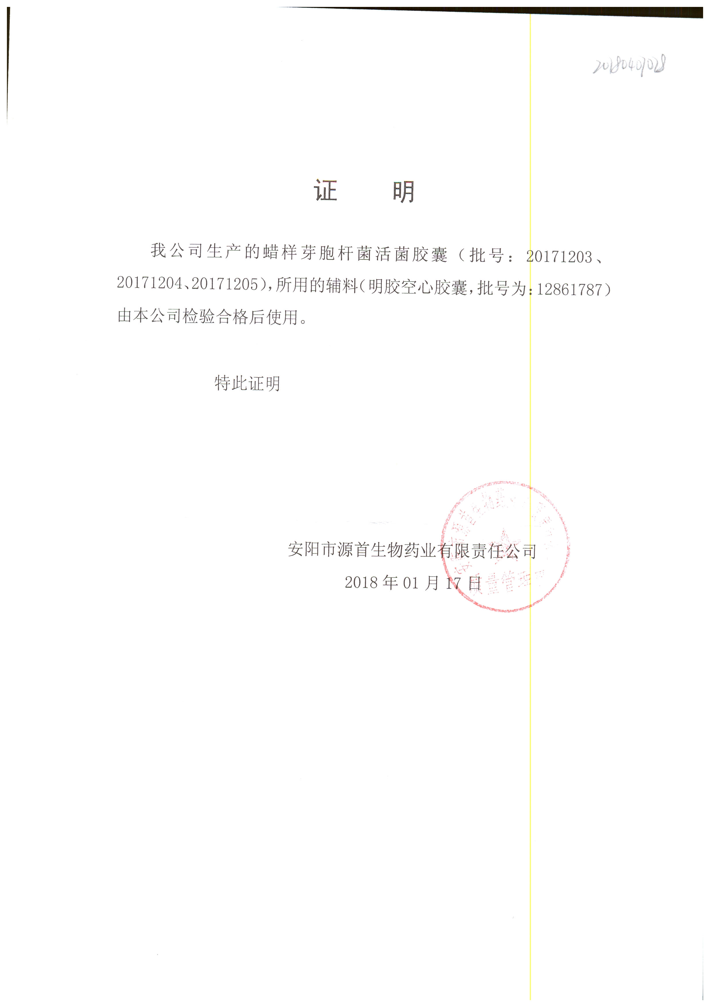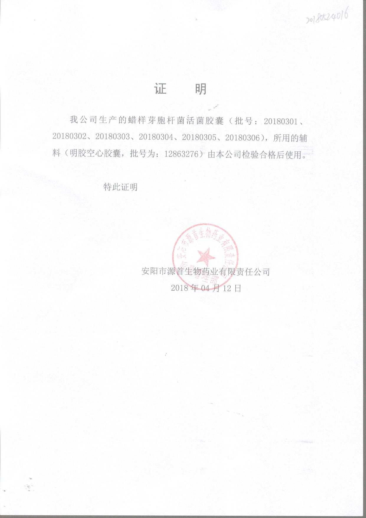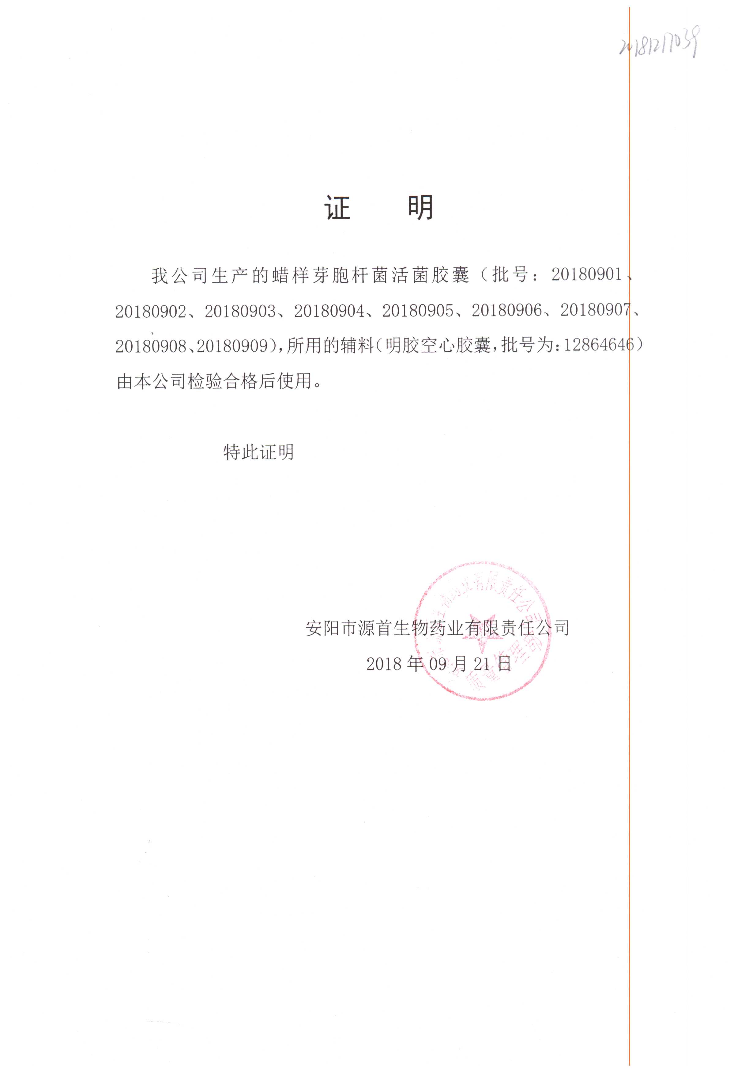 | 蠟樣芽孢桿菌活菌膠囊(源首) | 0.25g | 20180906(2/3) | 查看詳情 |