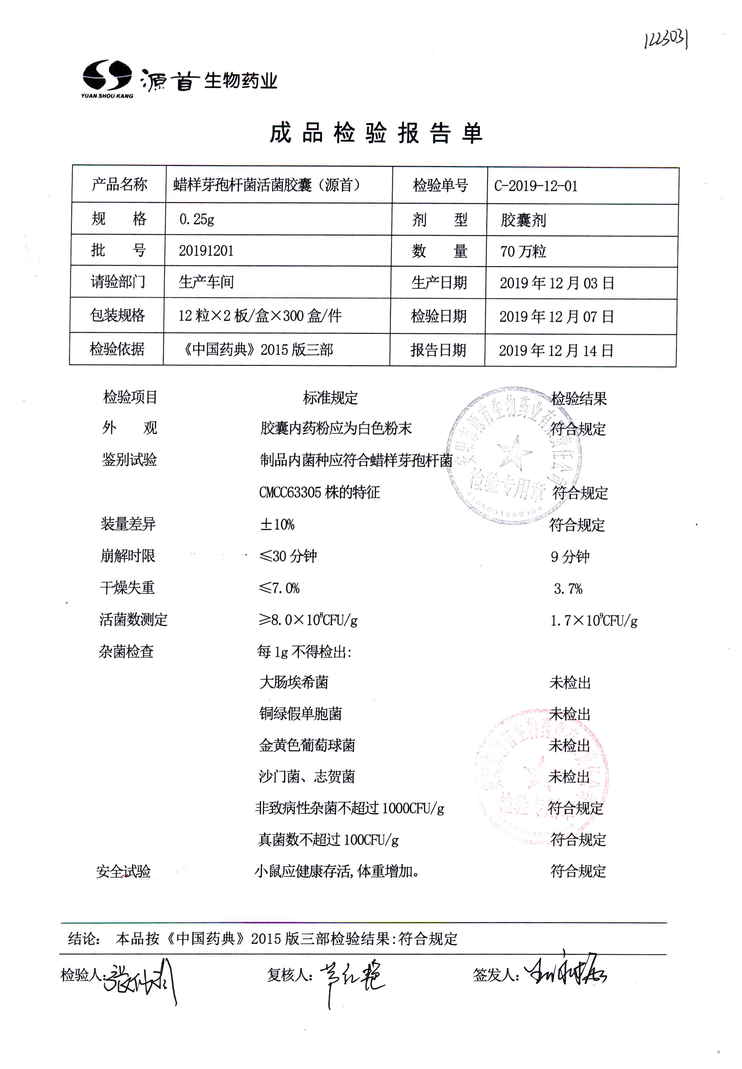 | 蠟樣芽孢桿菌活菌膠囊(源首) | 0.25g | 20191201(2/3) | 查看詳情 |