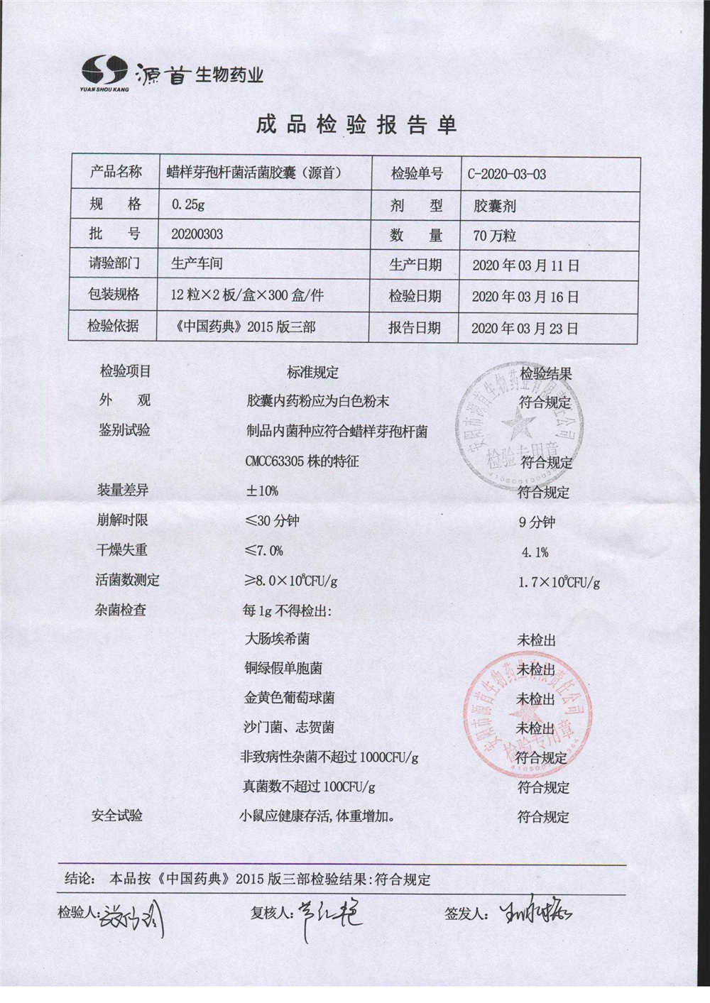 | 蠟樣芽孢桿菌活菌膠囊(源首) | 0.25g | 20200303(3/3) | 查看詳情 |