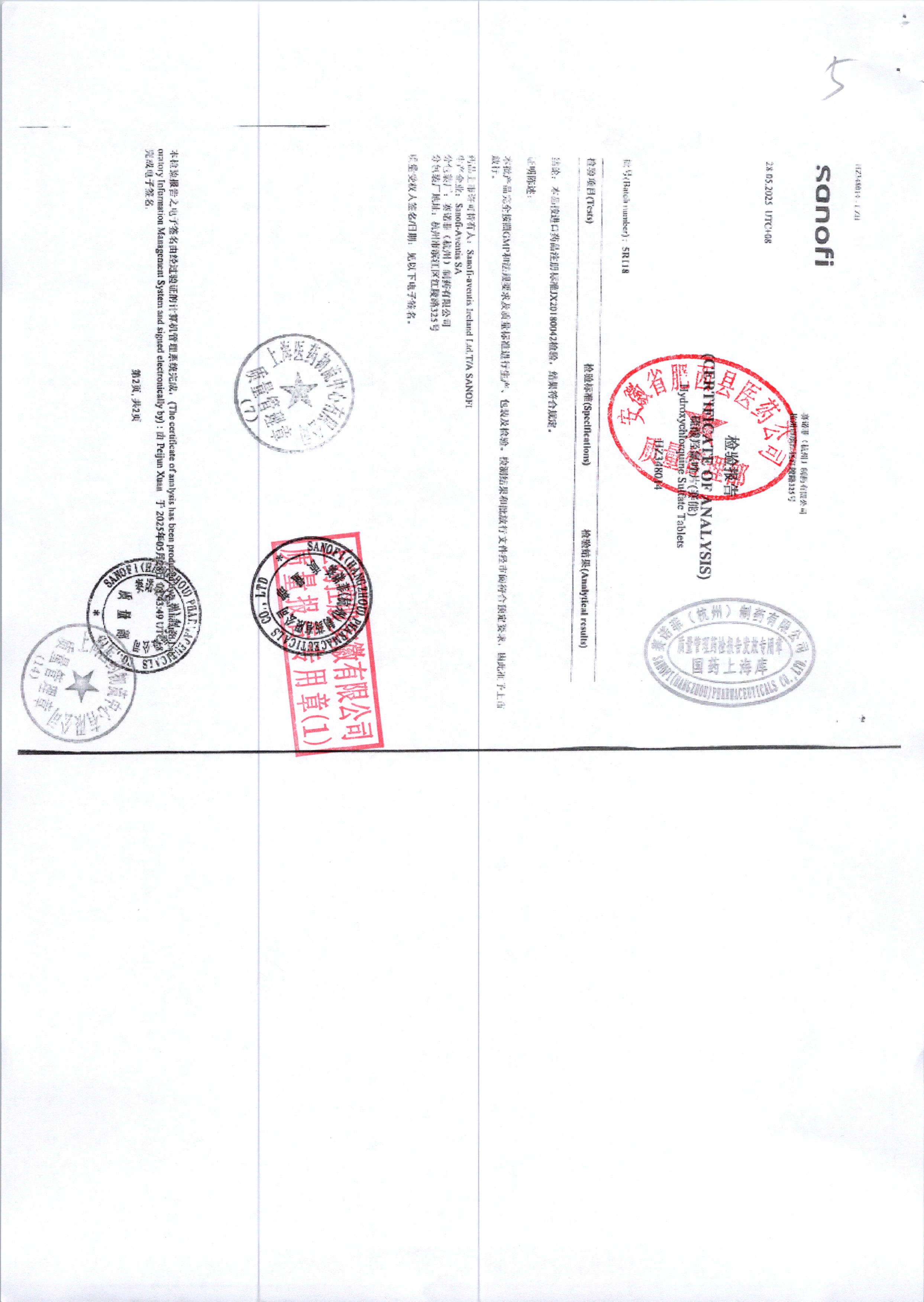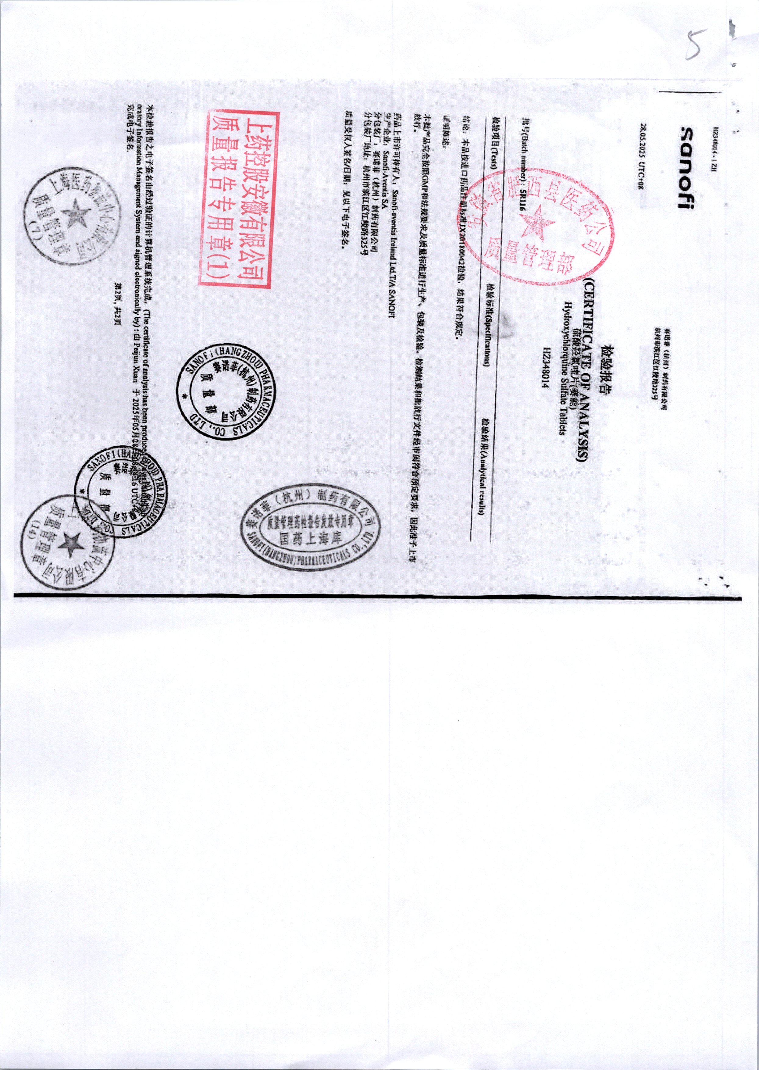 | 硫酸羥氯喹片 | 0.2*10s | 5R120/1 | 查看詳情 |
