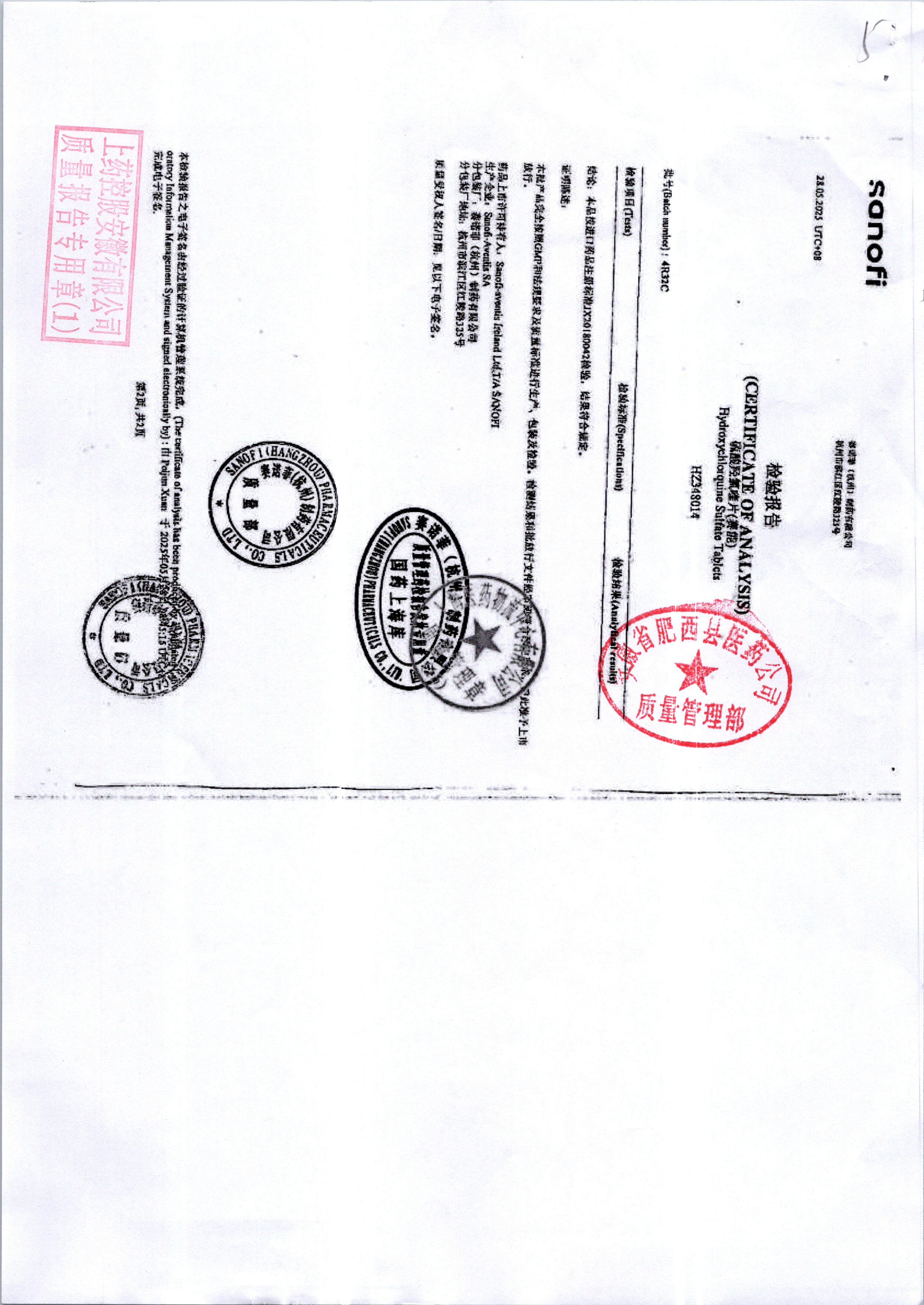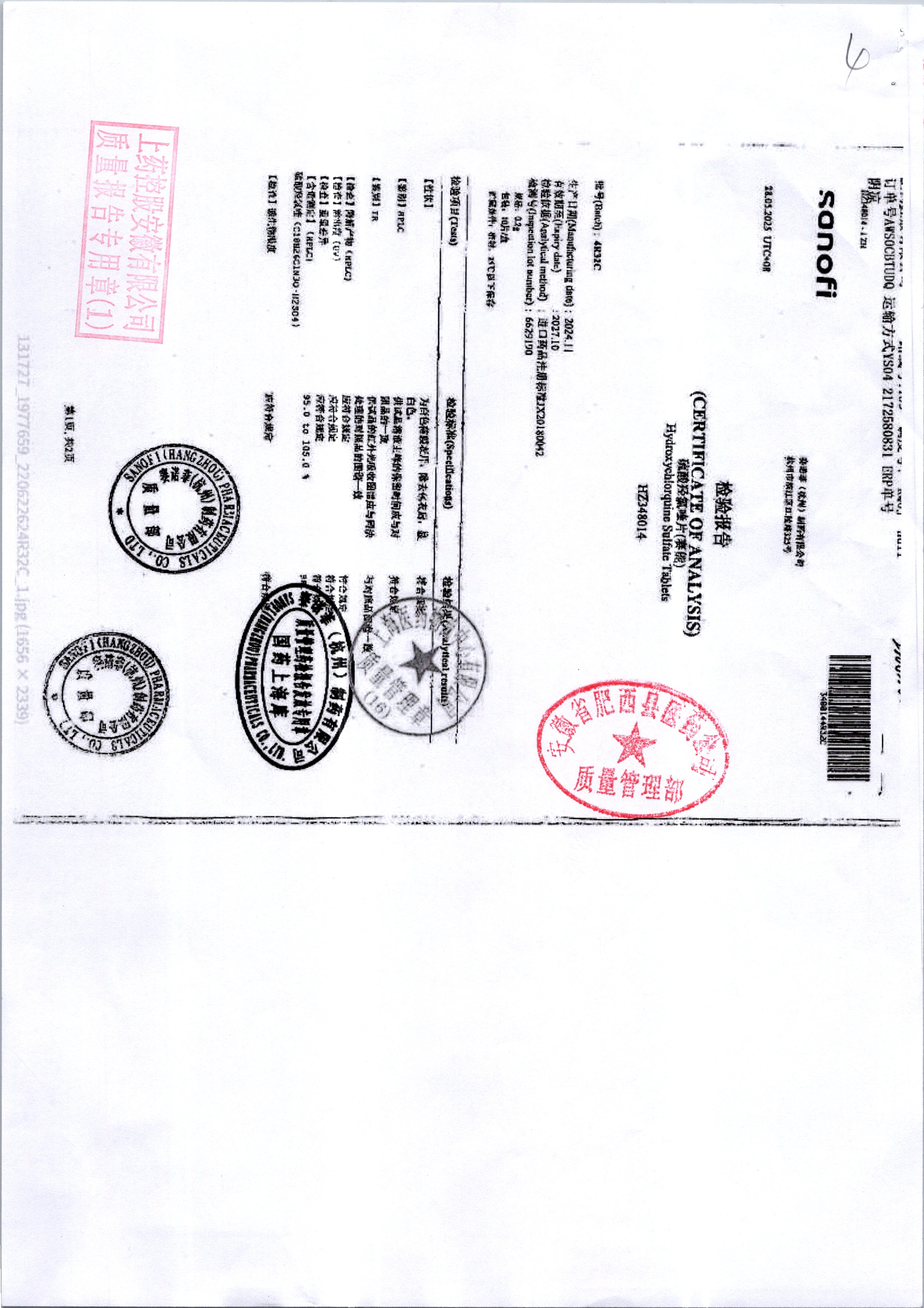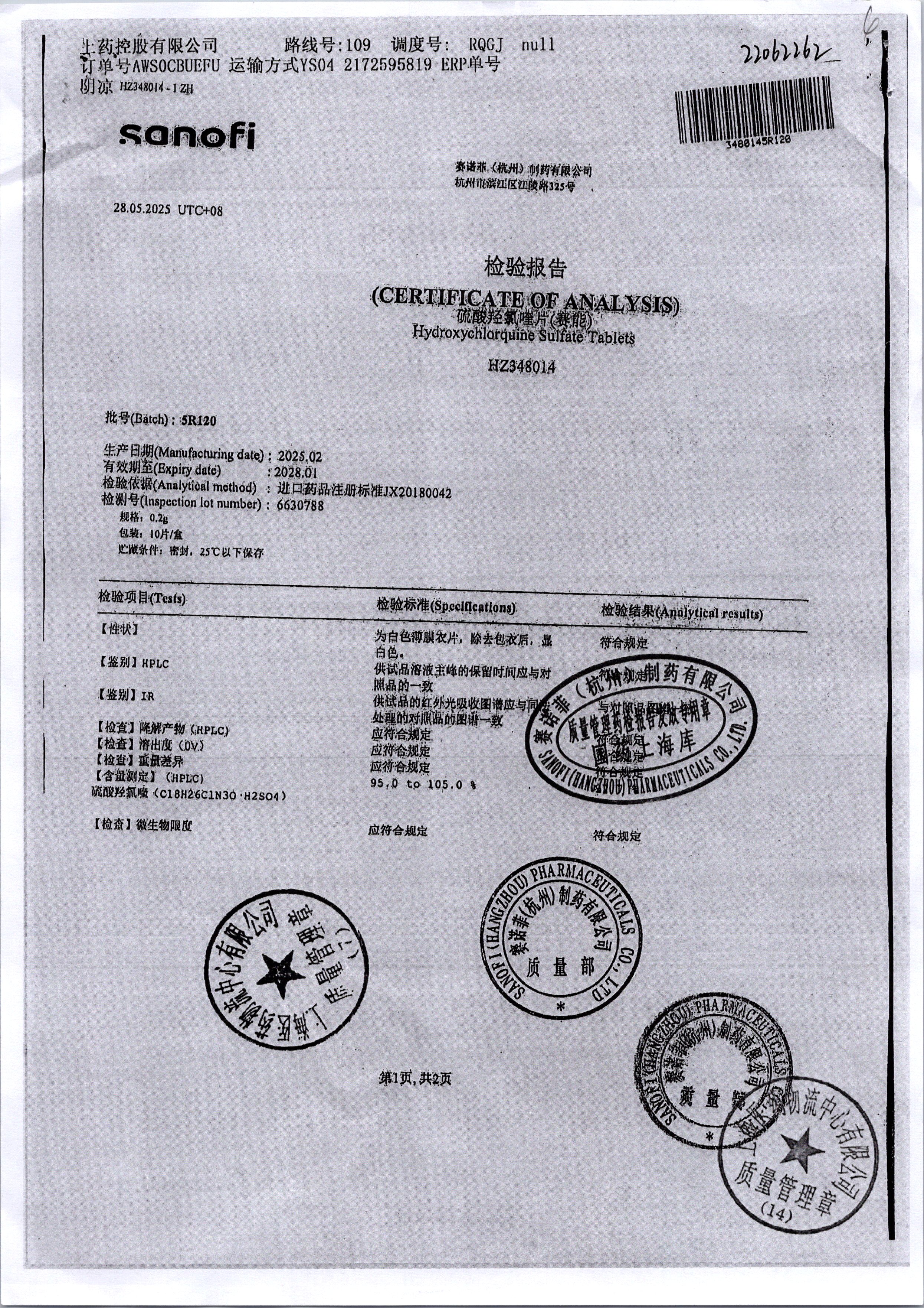 | 硫酸羥氯喹片 | 0.2*10s | 5R120/2 | 查看詳情 |