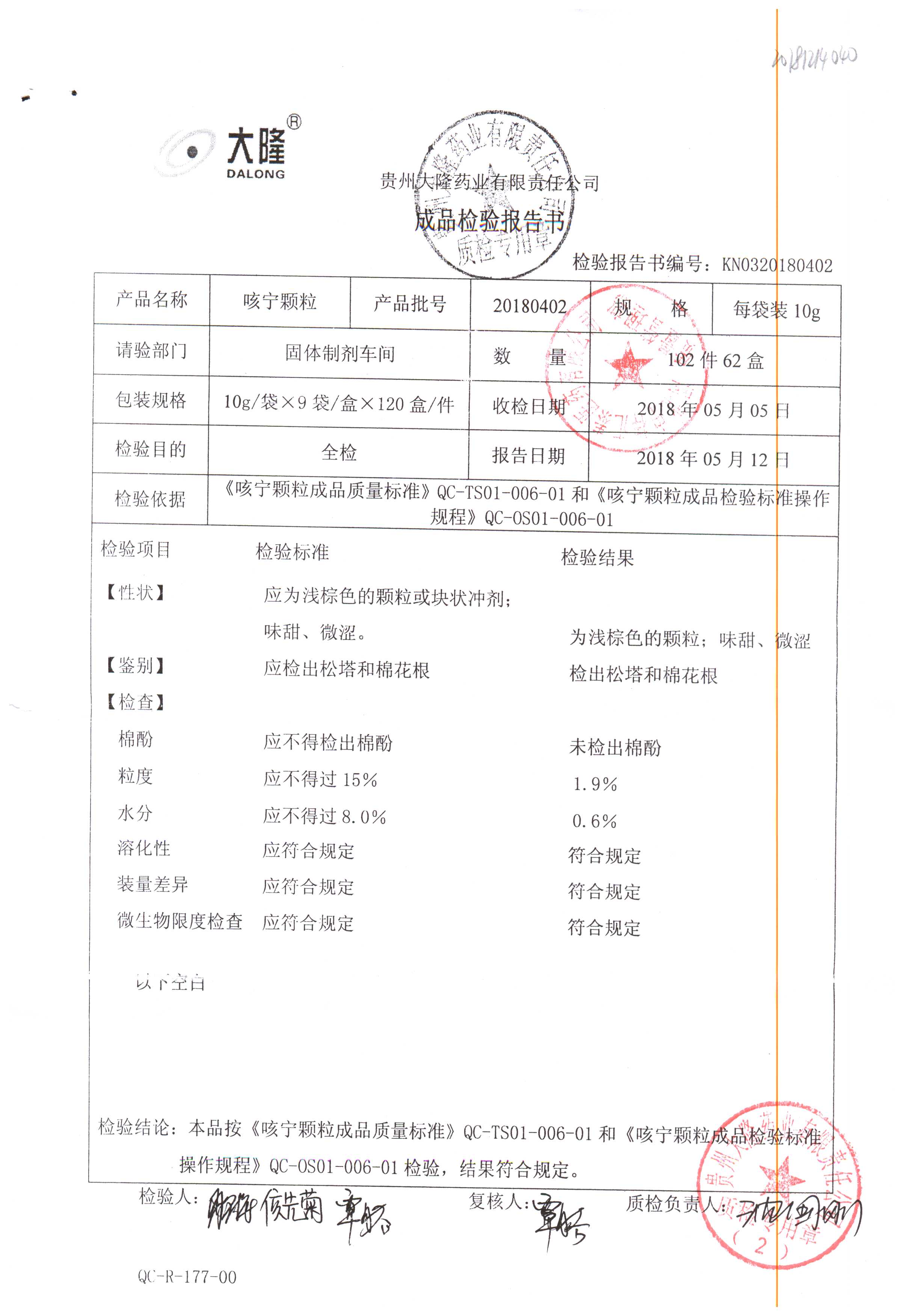 | 咳寧顆粒 | 10g*9袋 | 20180402 | 查看詳情 |