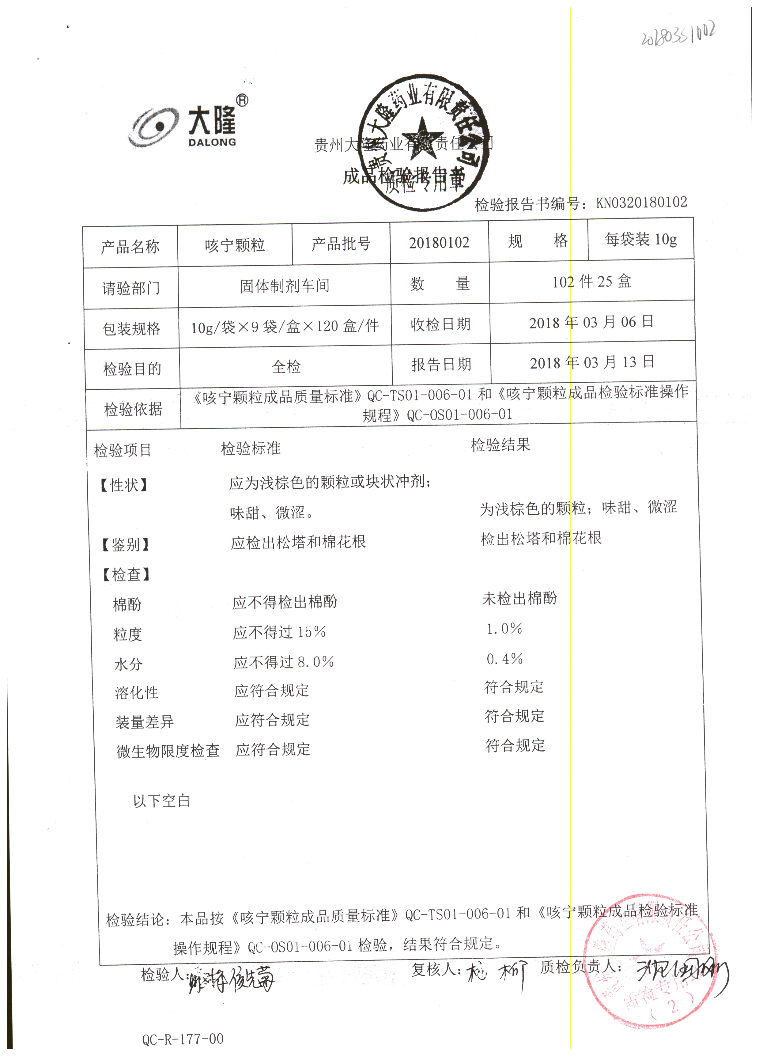 | 咳寧顆粒 | 10g*9袋 | 20180102 | 查看詳情 |