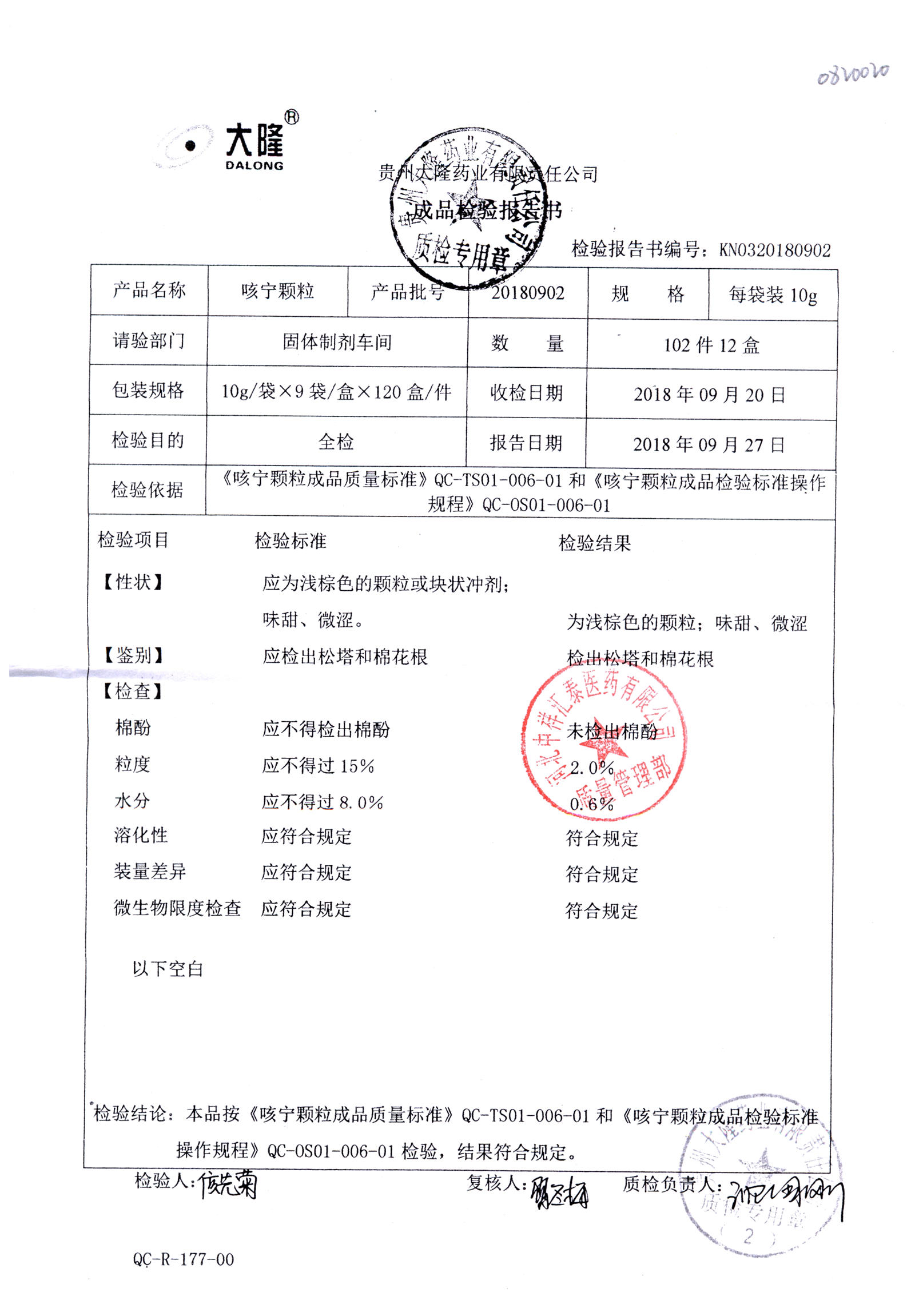| 咳寧顆粒 | 10g*9袋 | 20181201 | 查看詳情 |