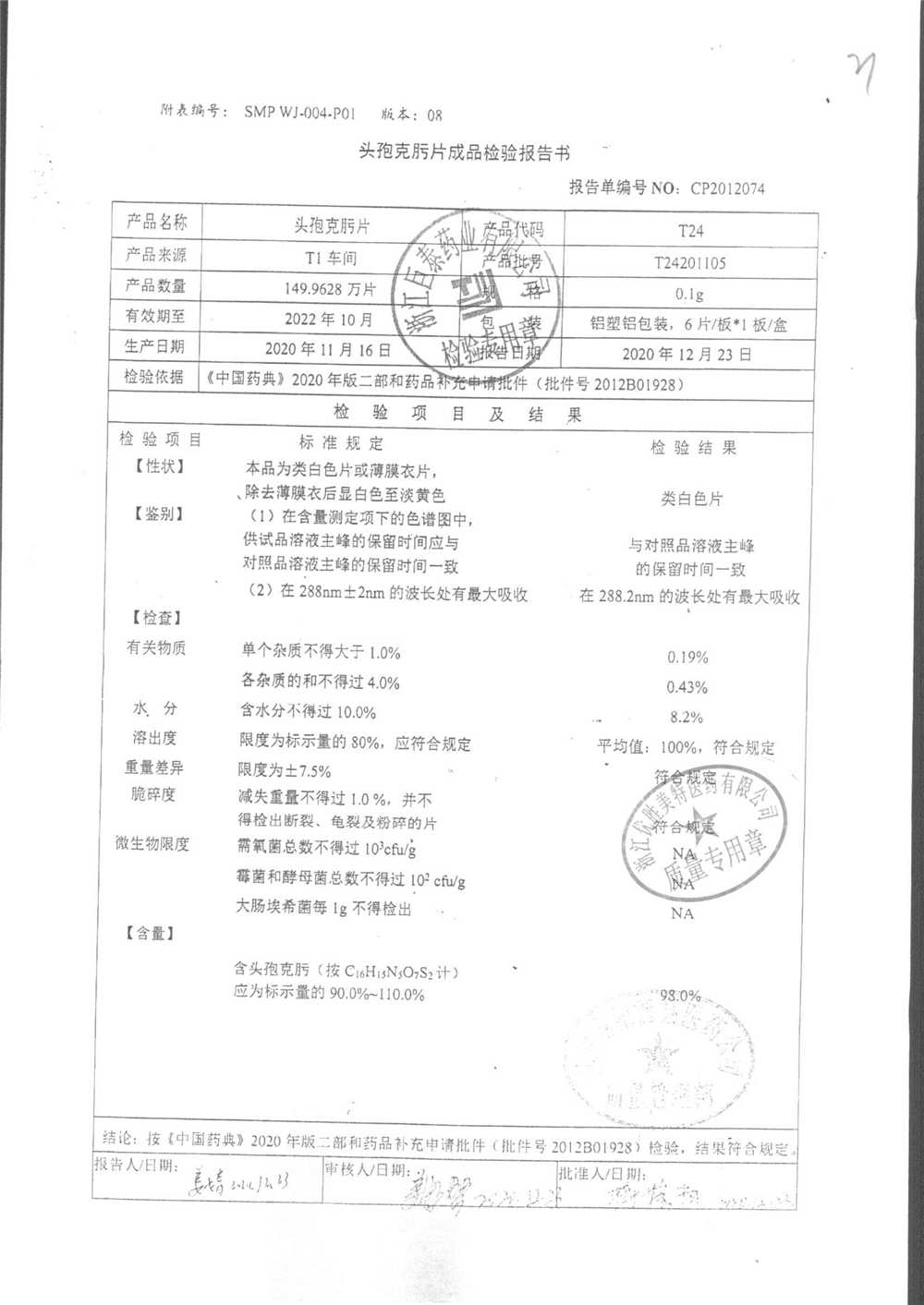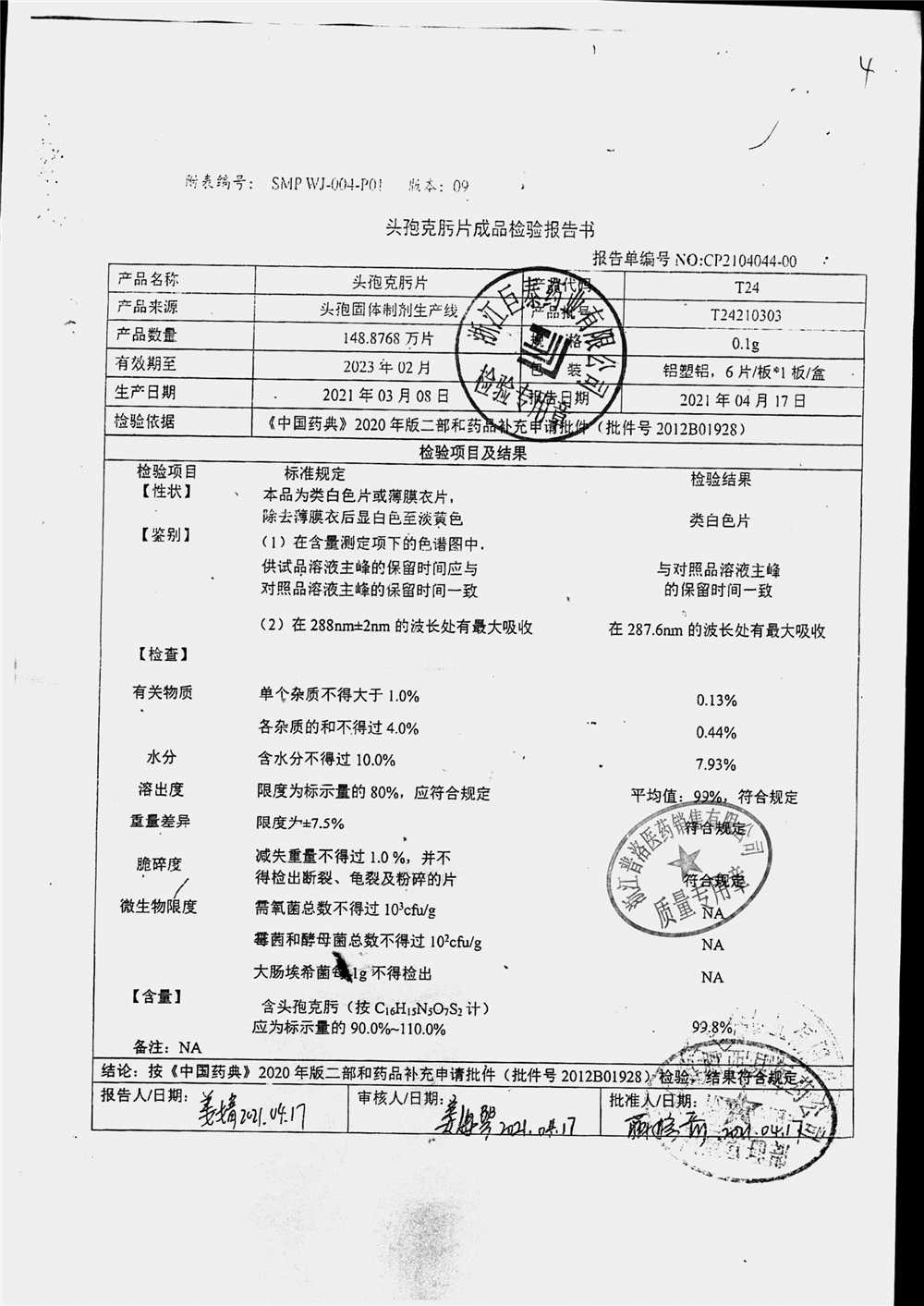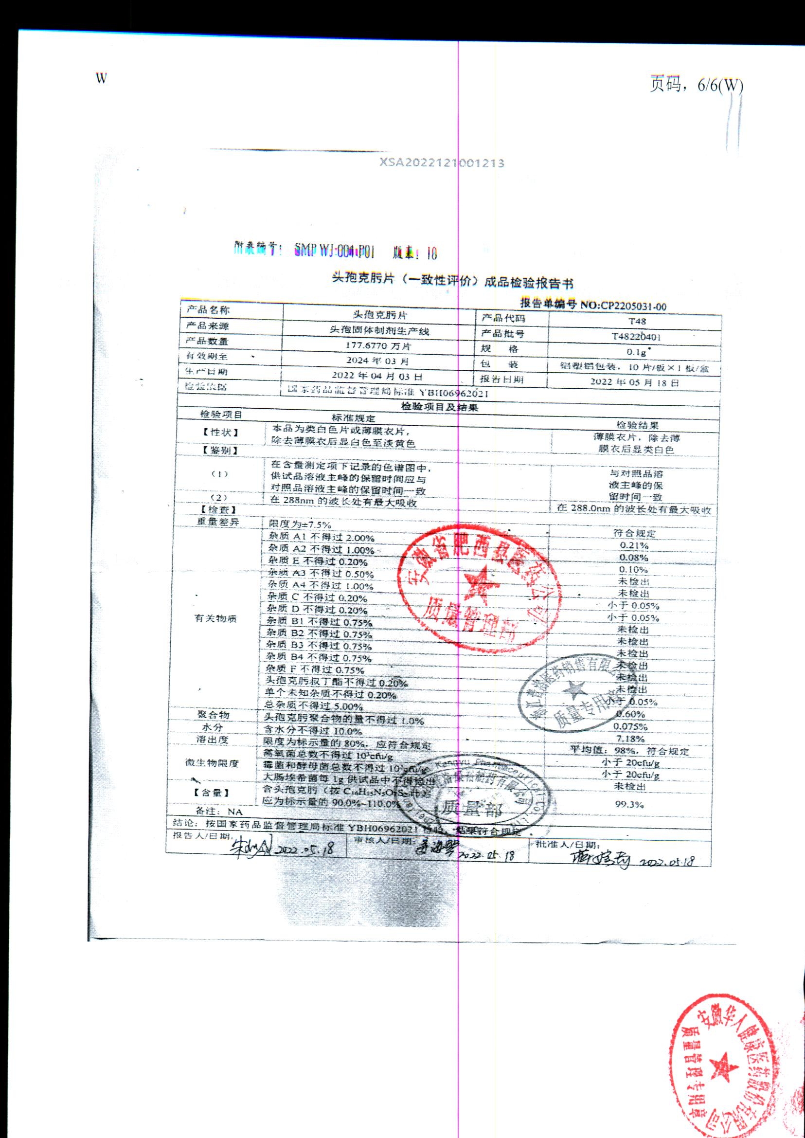 | 頭孢克肟片 | 0.1g*10s | T24210501 | 查看詳情 |