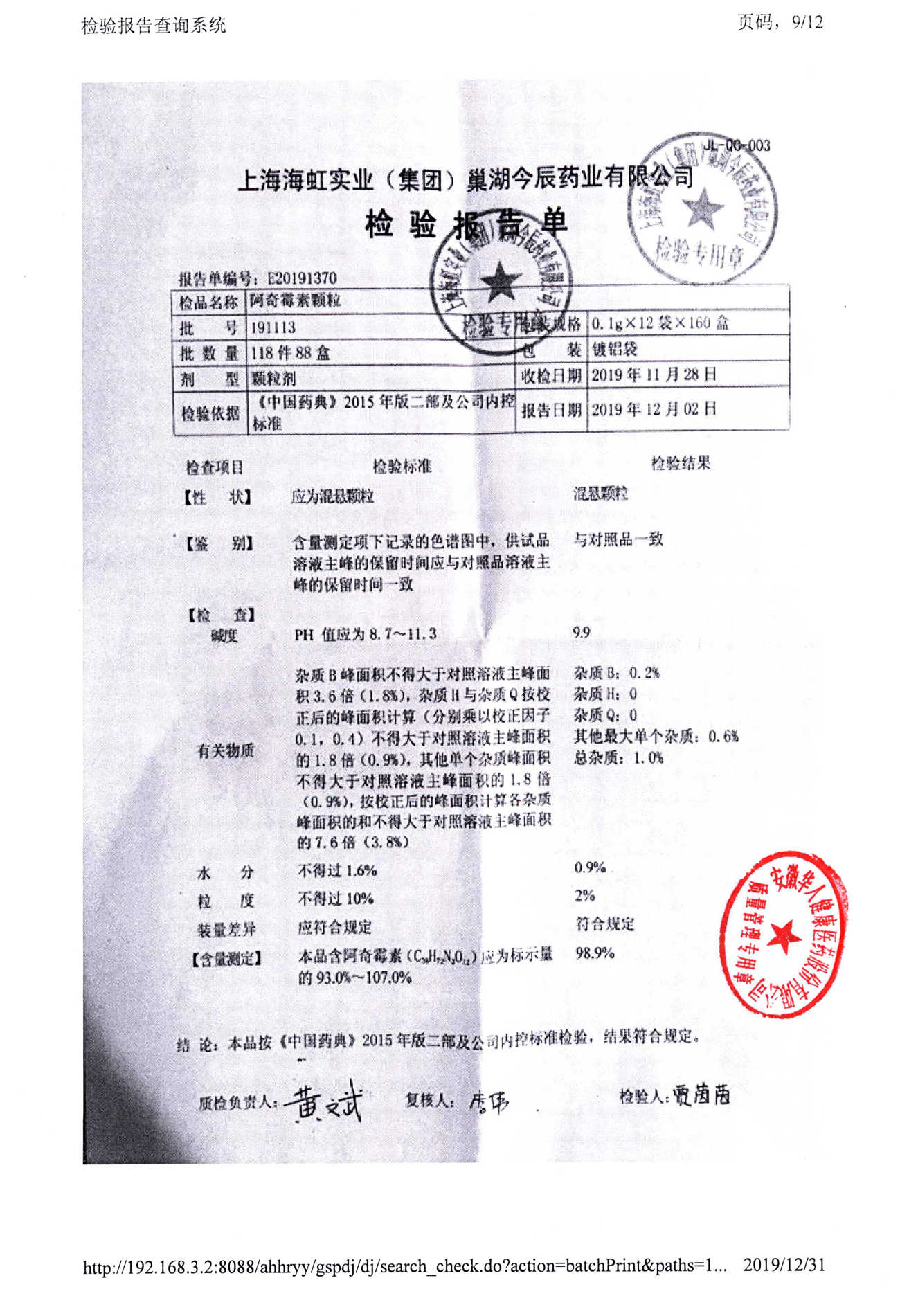 阿奇霉素顆粒 0.1g-12袋 191113 查看詳情