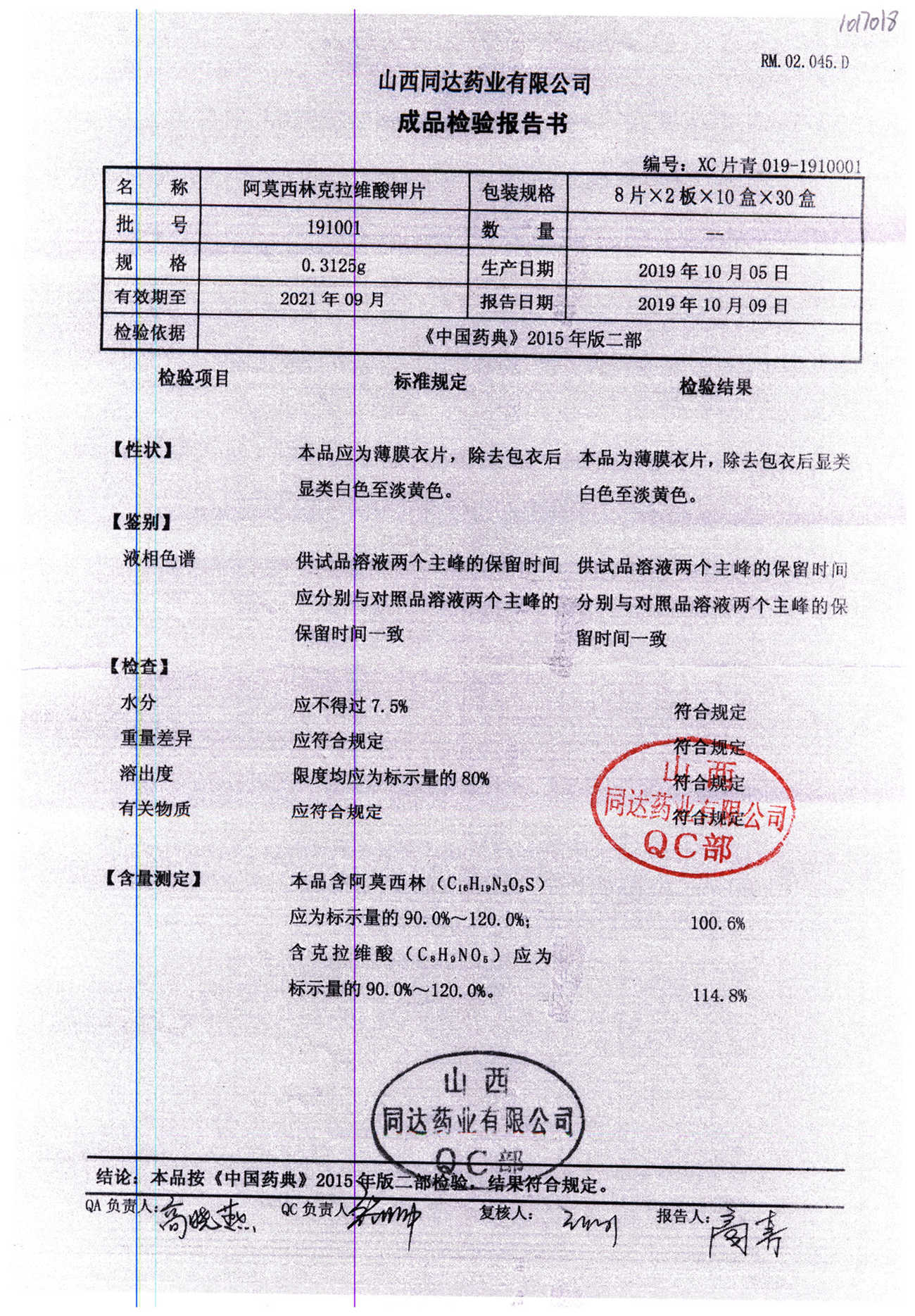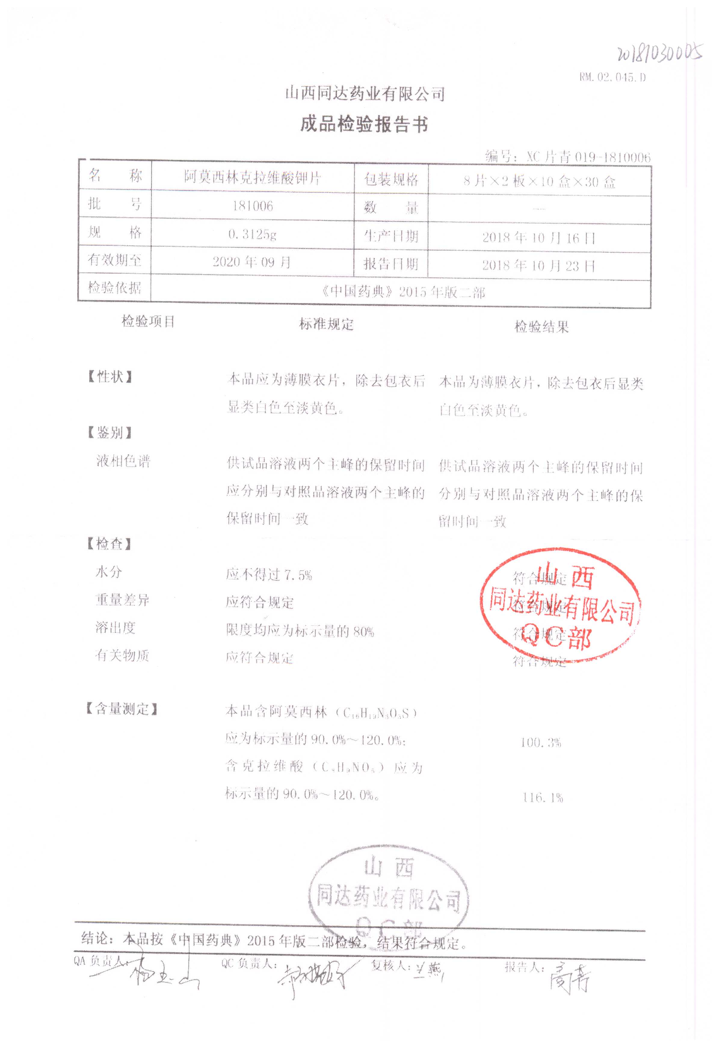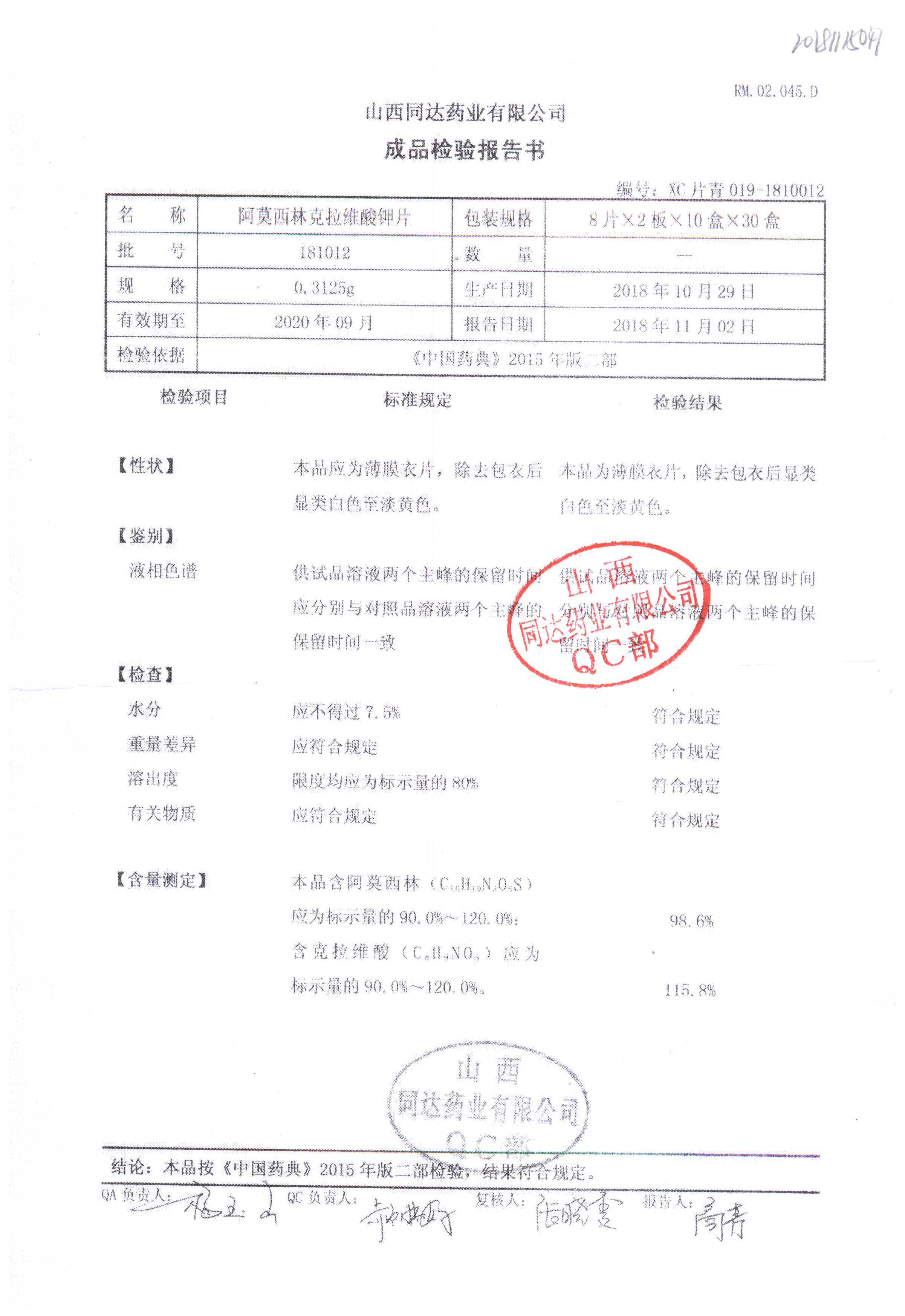 | 阿莫西林克拉維酸鉀片 | 0.3125g*16s | 190326 | 查看詳情 |