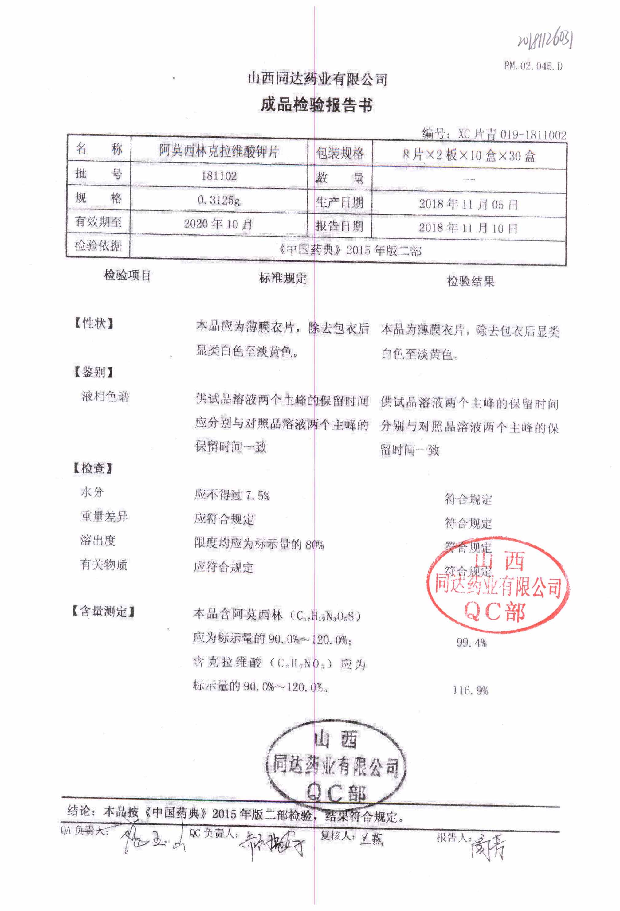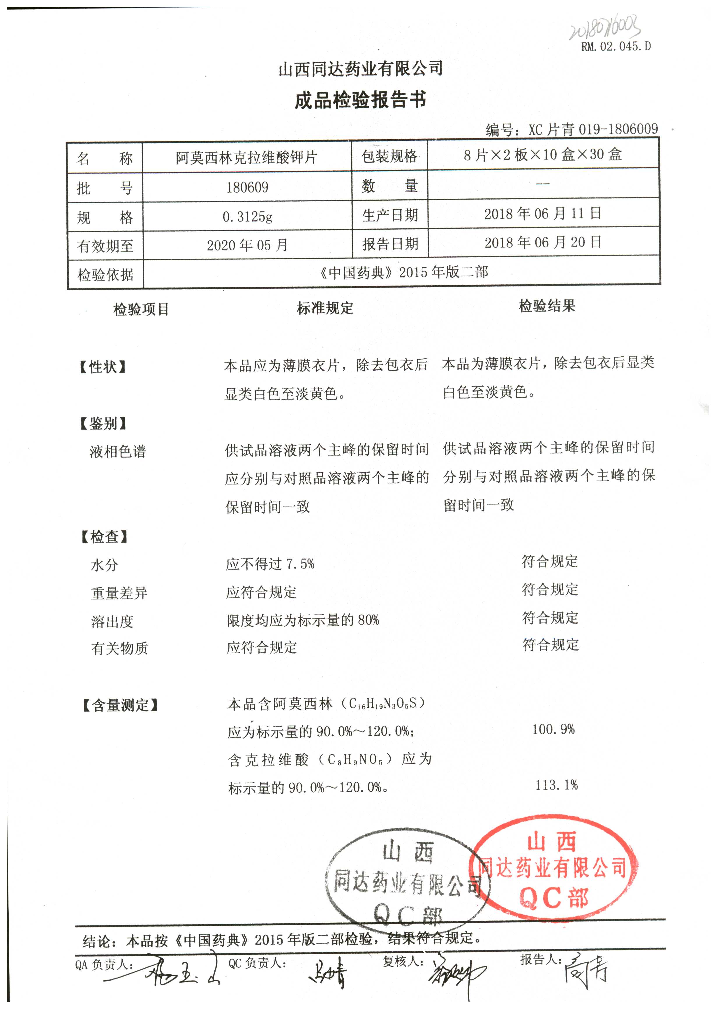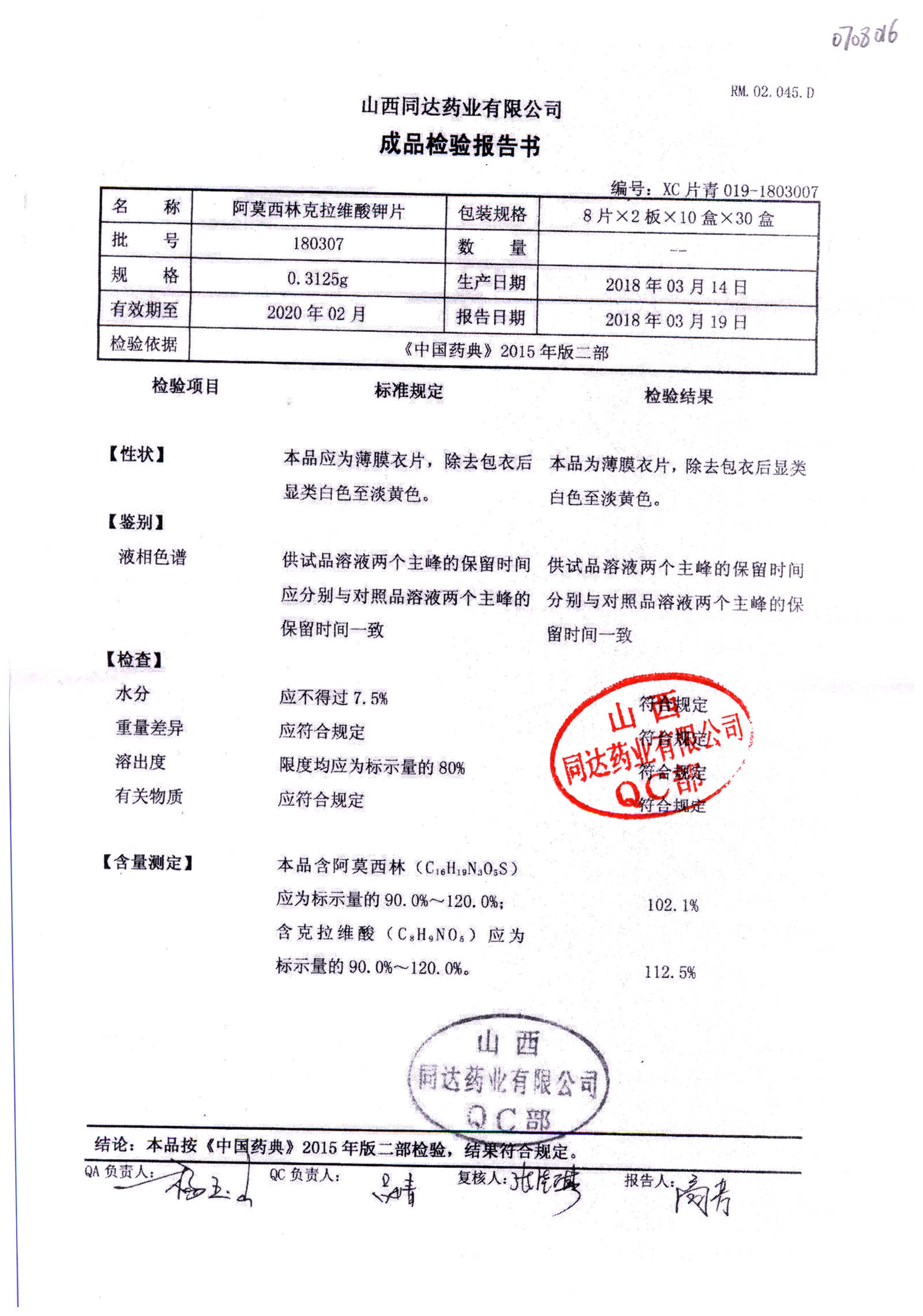 | 阿莫西林克拉維酸鉀片 | 0.3125g*16s | 180607 | 查看詳情 |