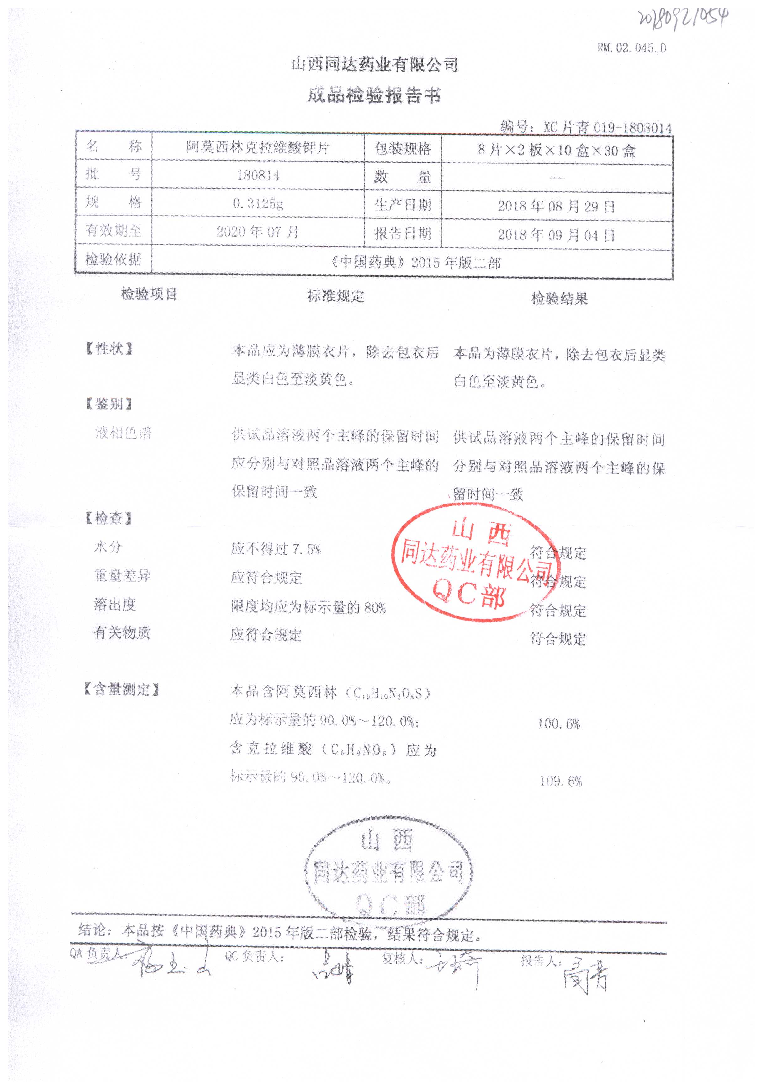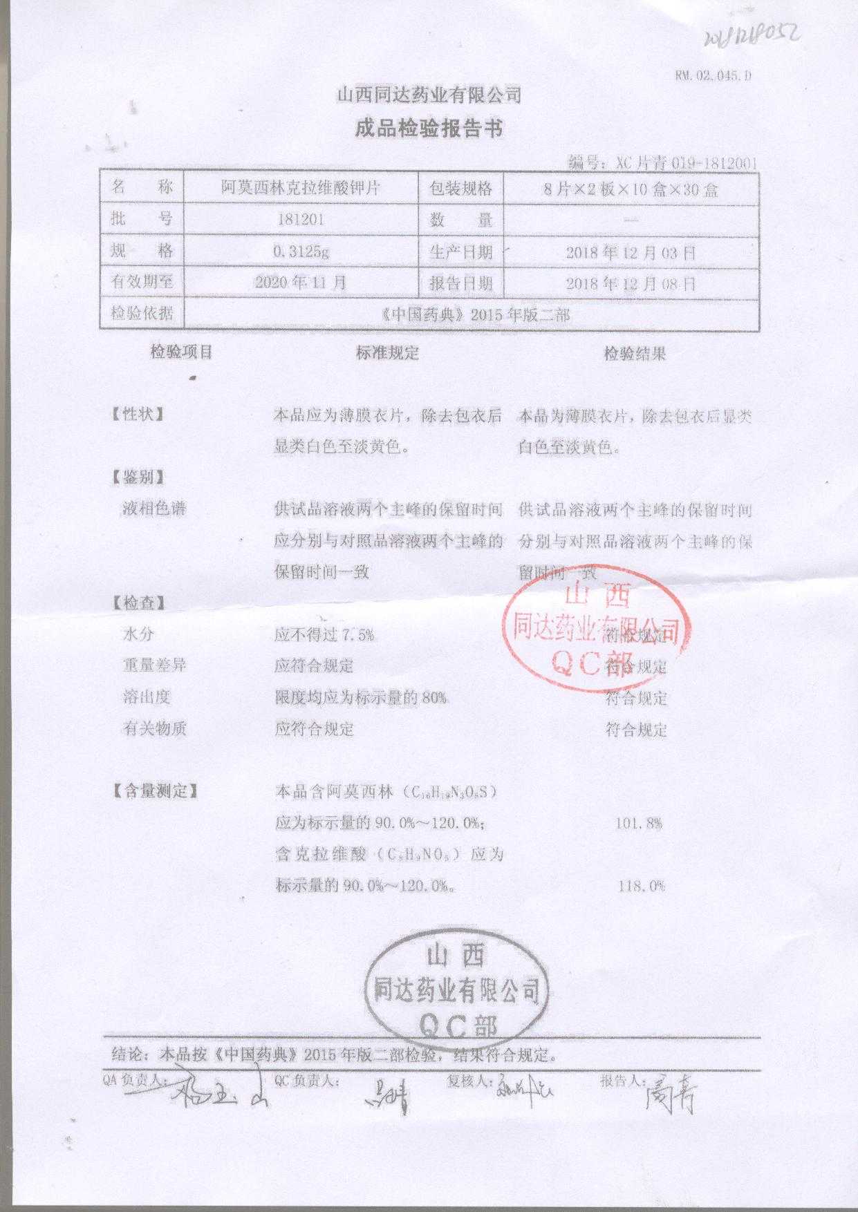 | 阿莫西林克拉維酸鉀片 | 0.3125g*16s | 190701 | 查看詳情 |