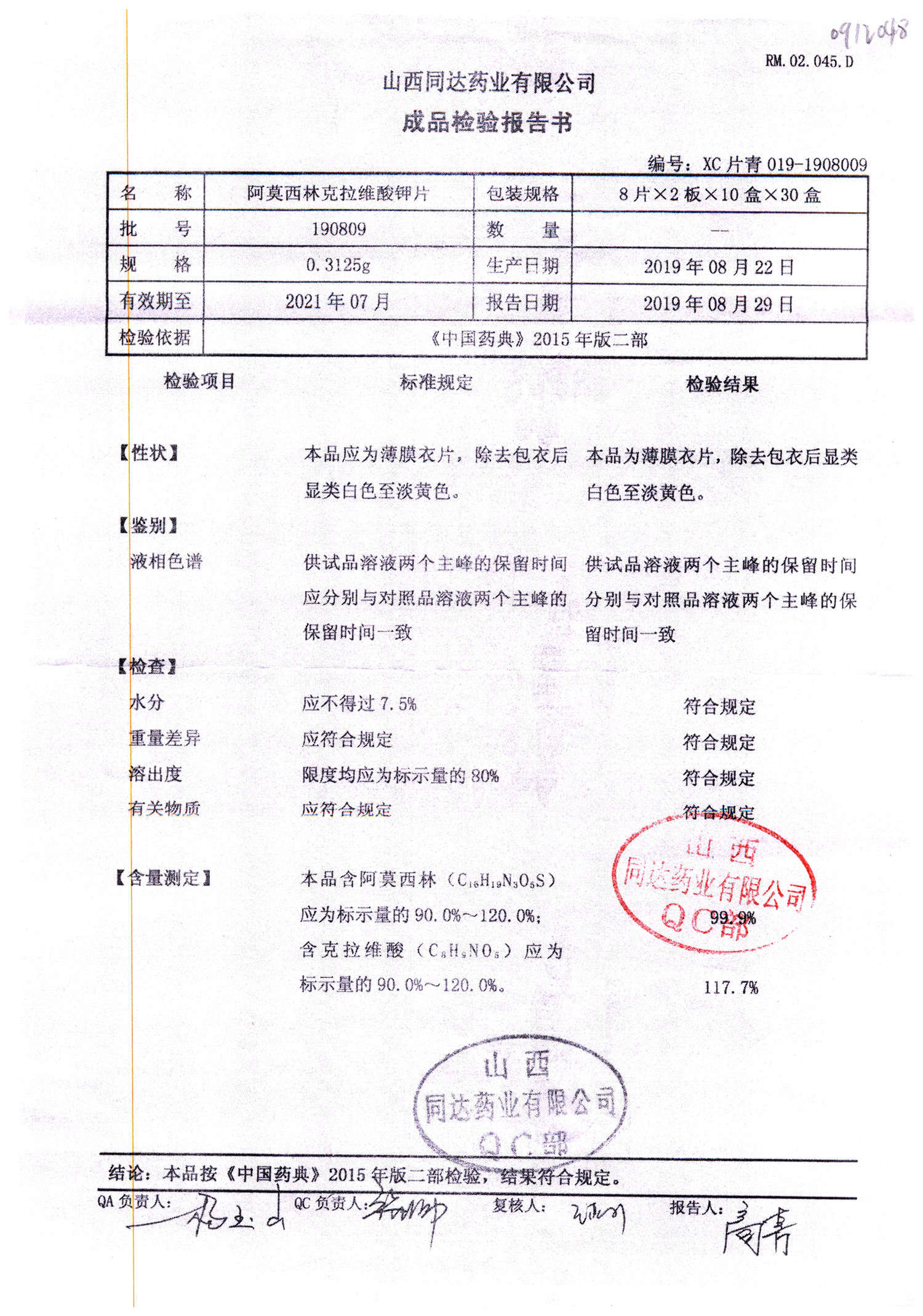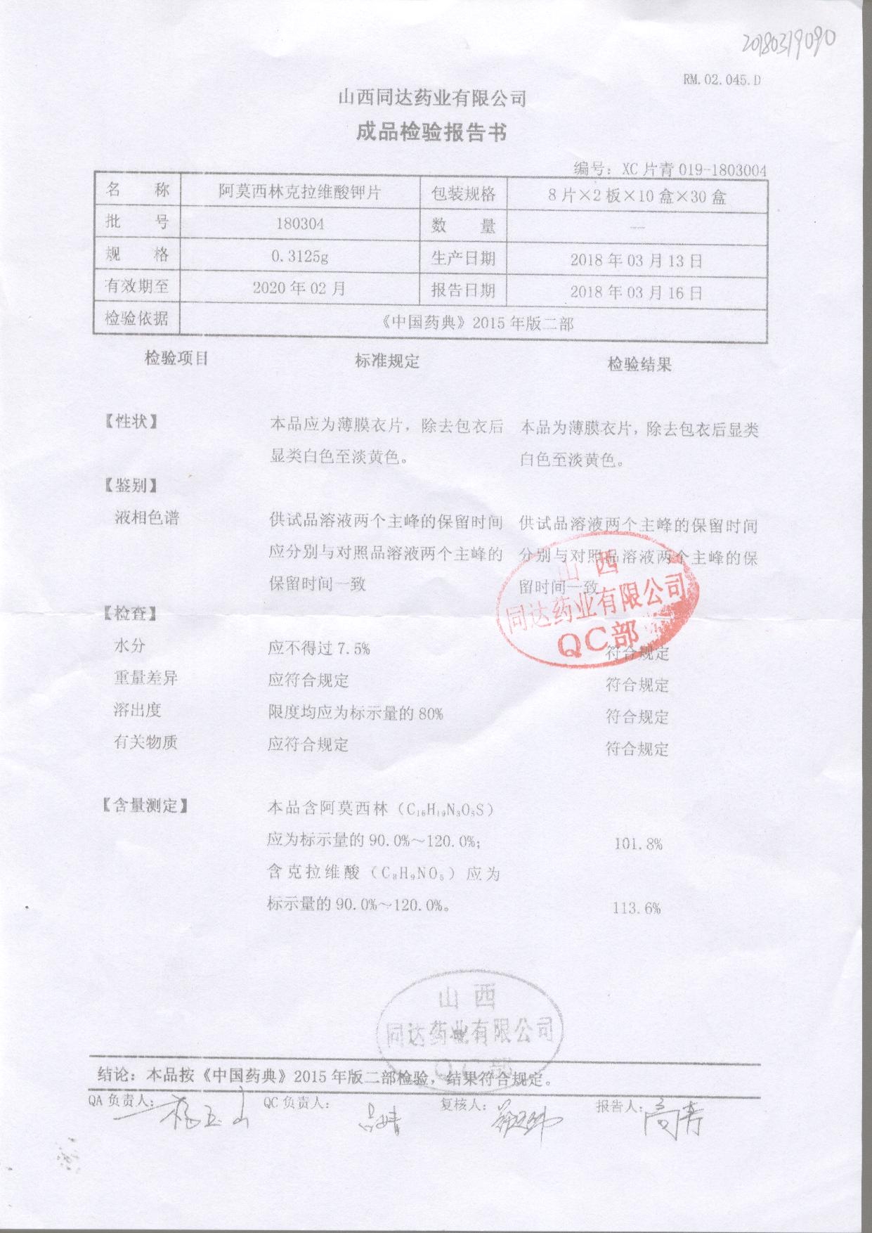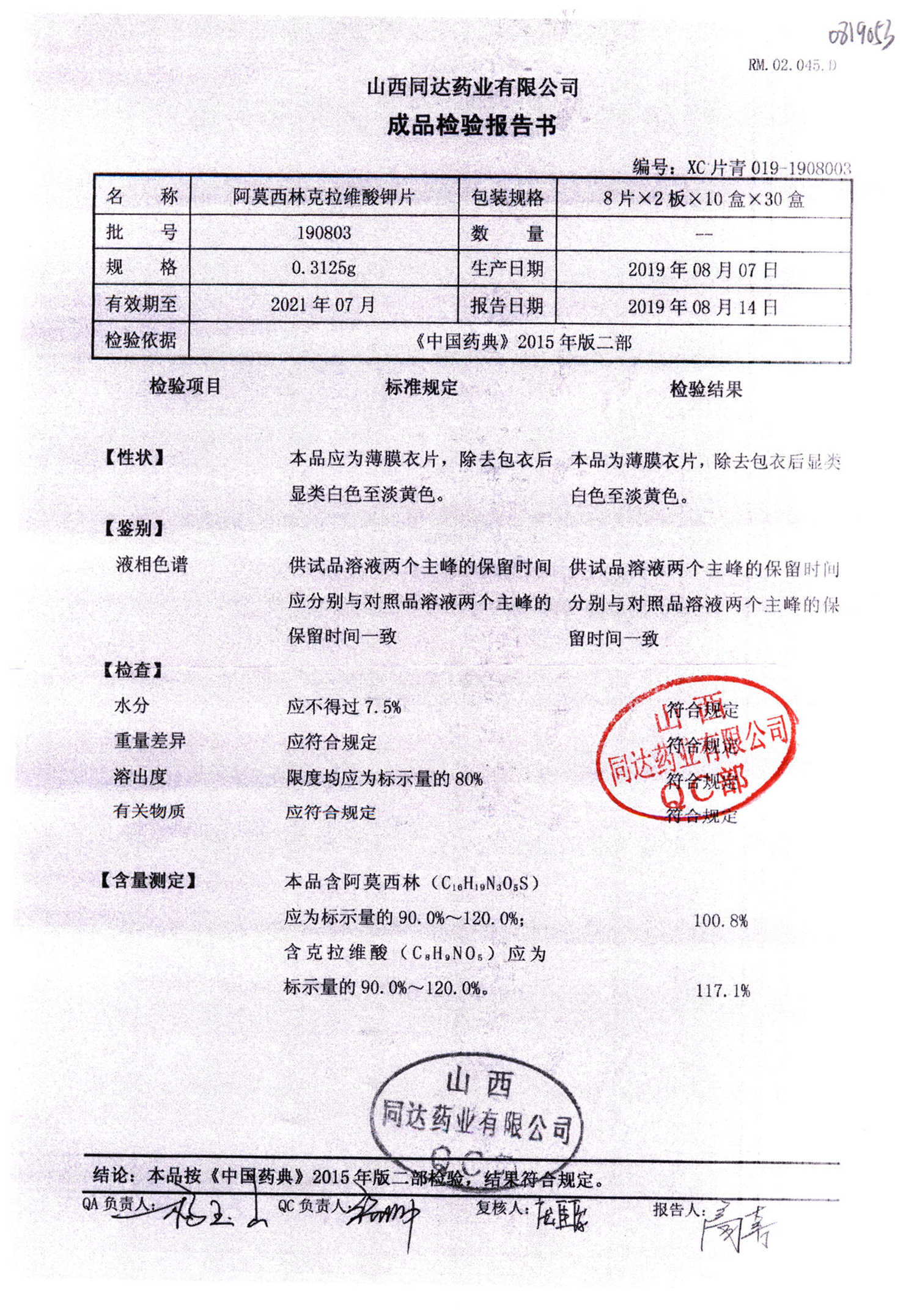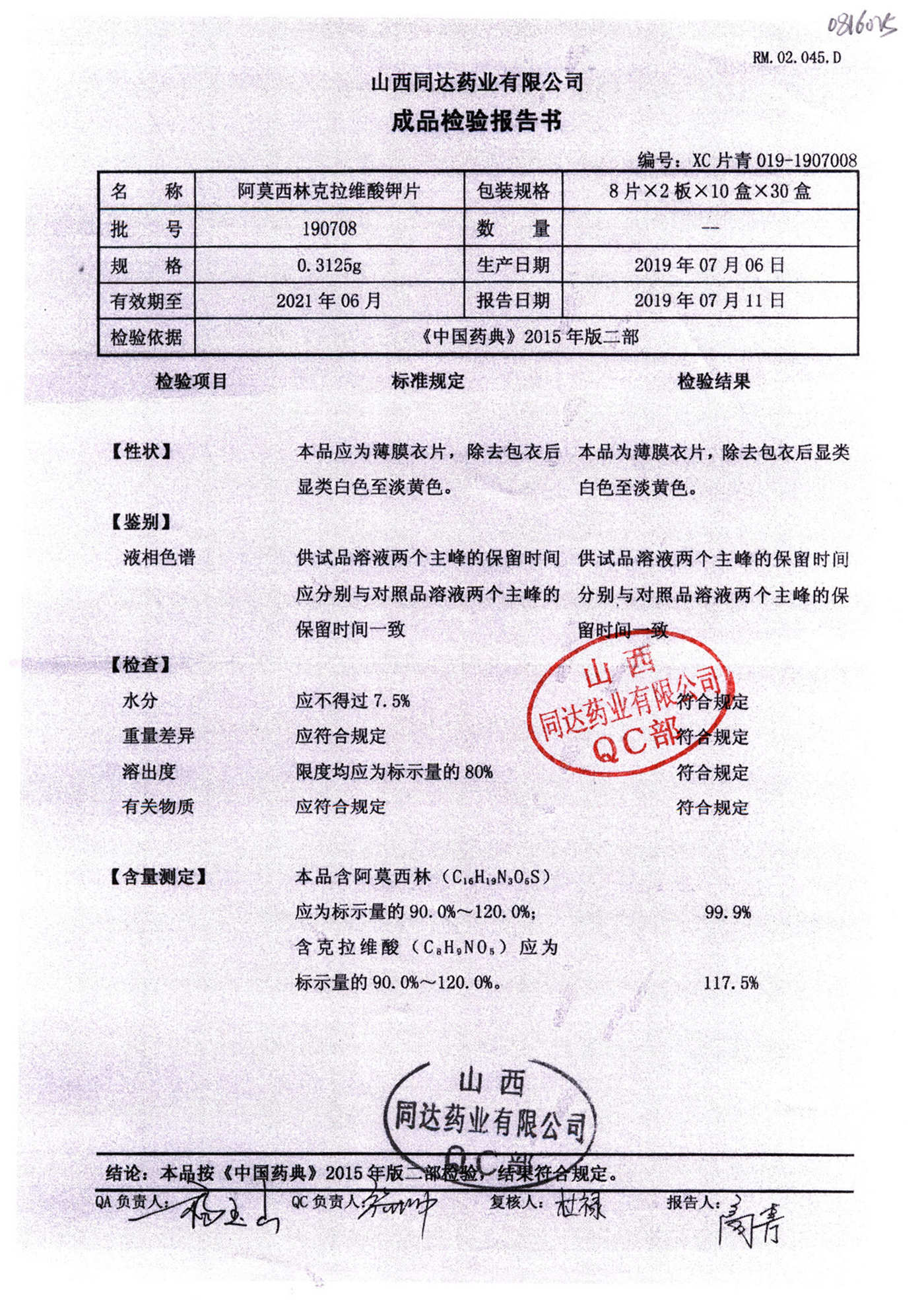 | 阿莫西林克拉維酸鉀片 | 0.3125g*16s | 190803 | 查看詳情 |