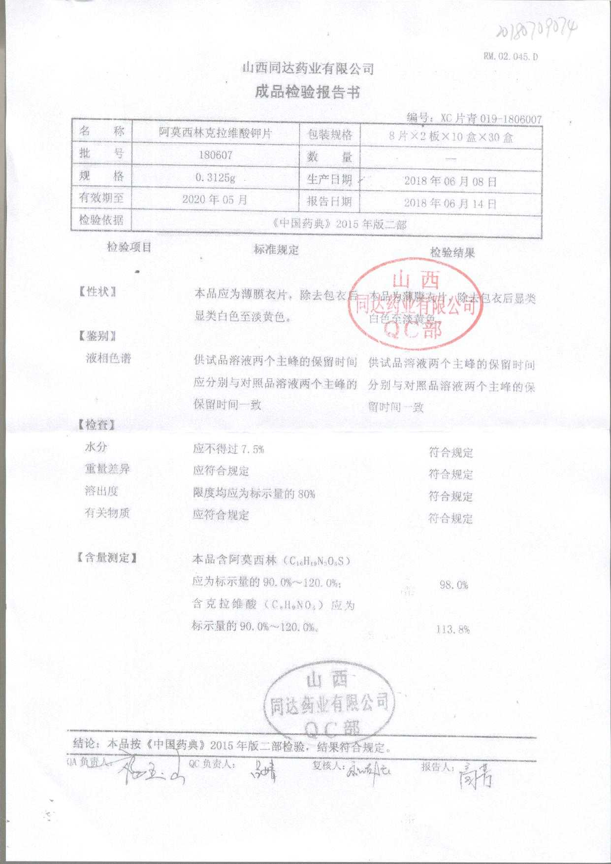 | 阿莫西林克拉維酸鉀片 | 0.3125g*16s | 180706 | 查看詳情 |