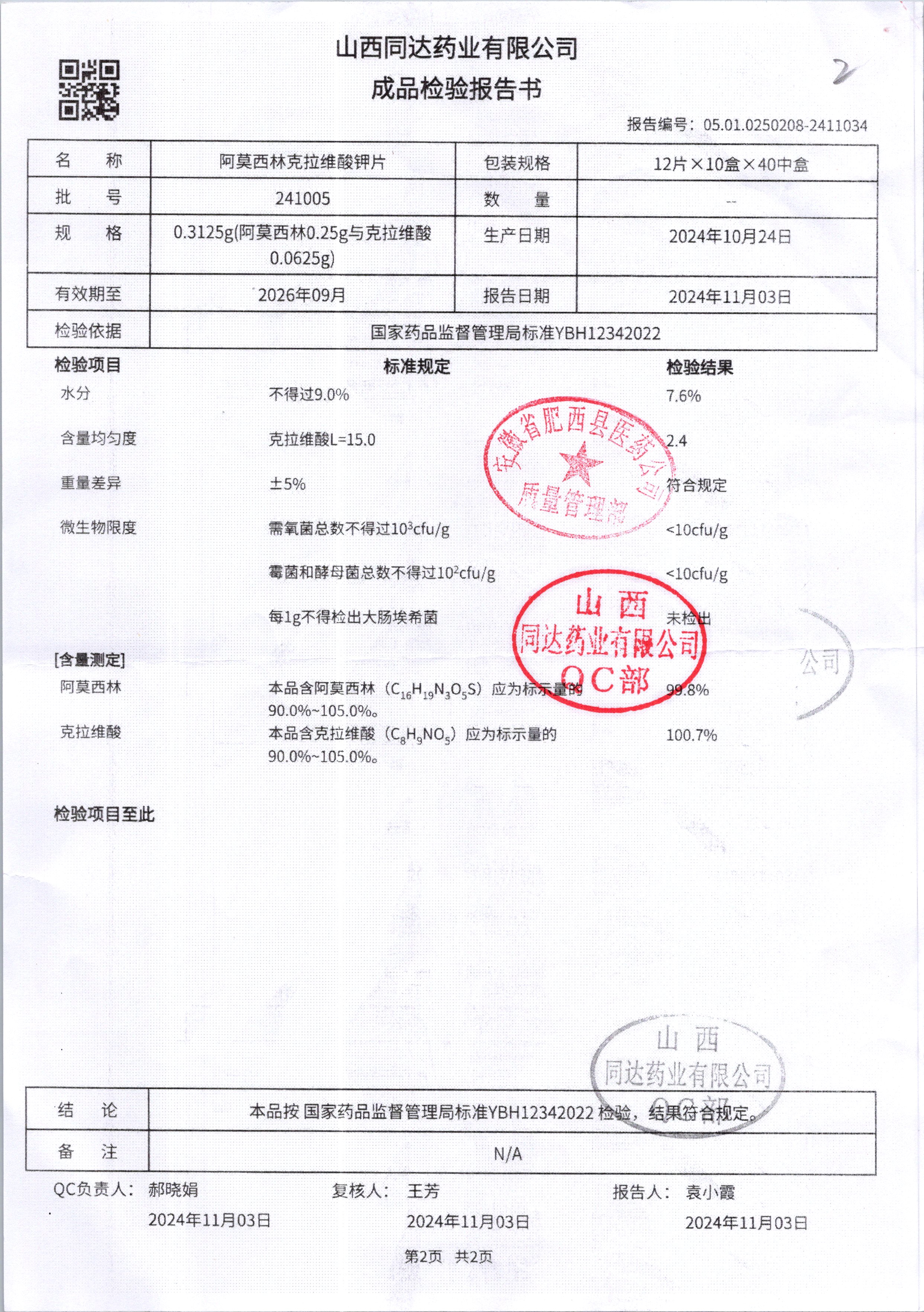| 阿莫西林克拉維酸鉀片 | 0.3125g*16s | 241005 | 查看詳情 |