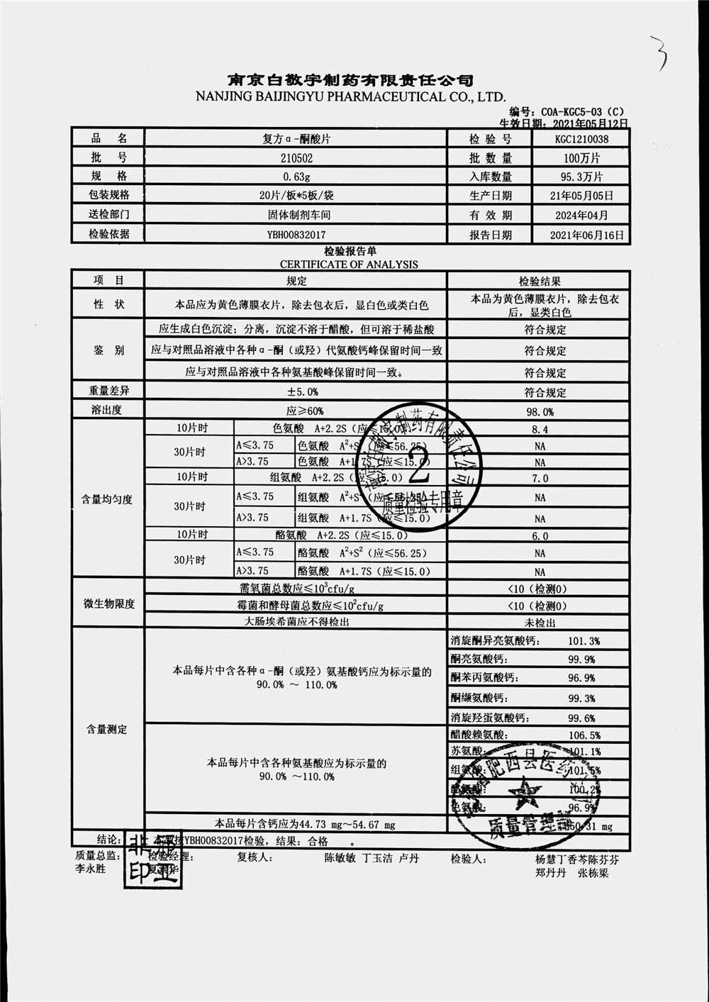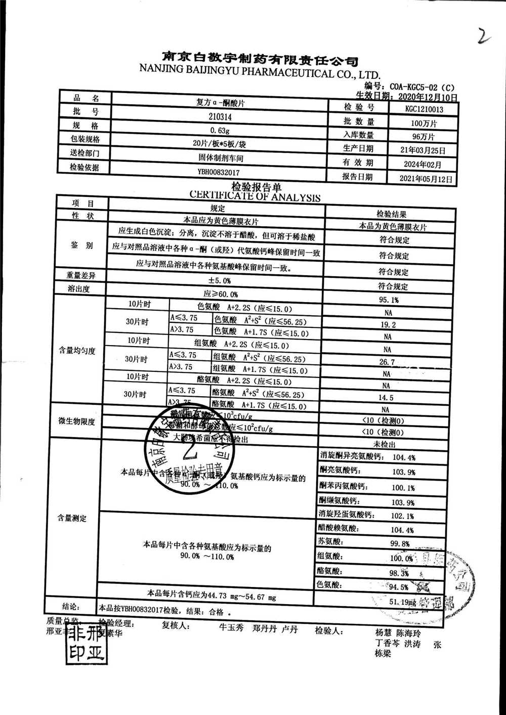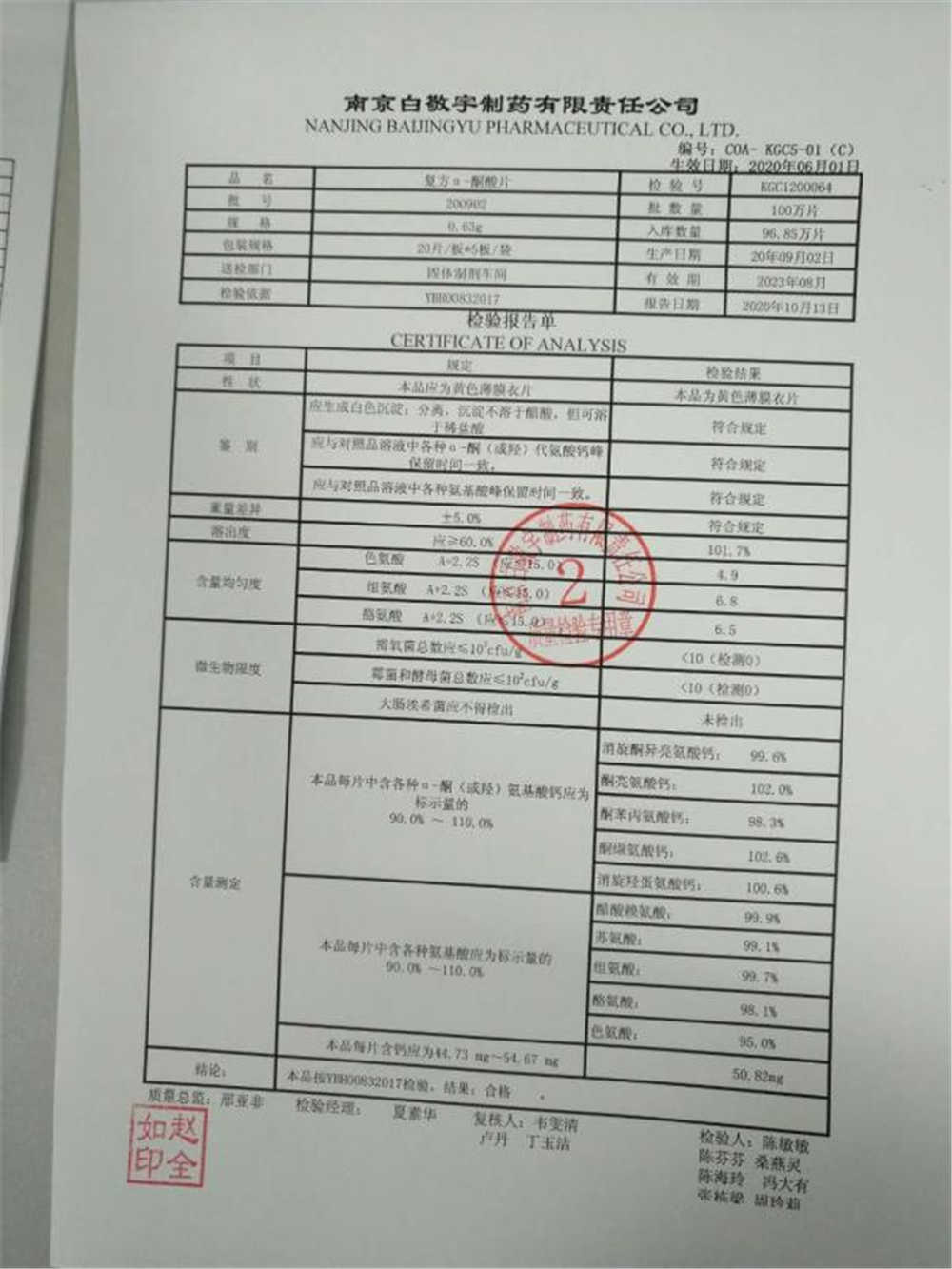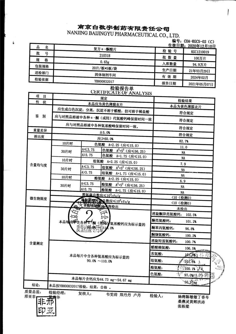| 復方a-酮酸片 | 0.63g*20s*5板 | 210408 | 查看詳情 |