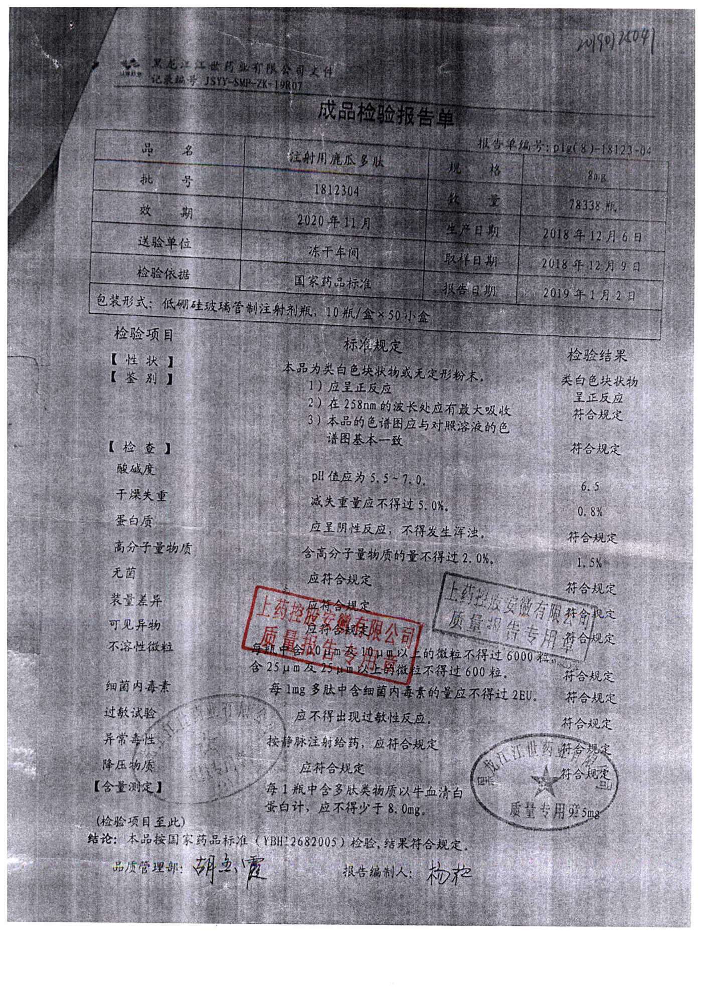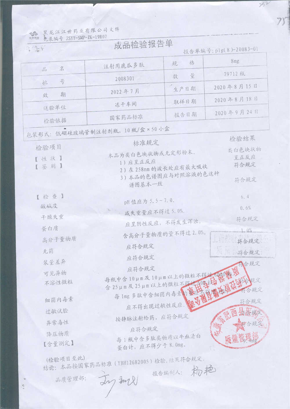 | 注射用鹿瓜多肽 | 8mg | 1910301 | 查看詳情 |