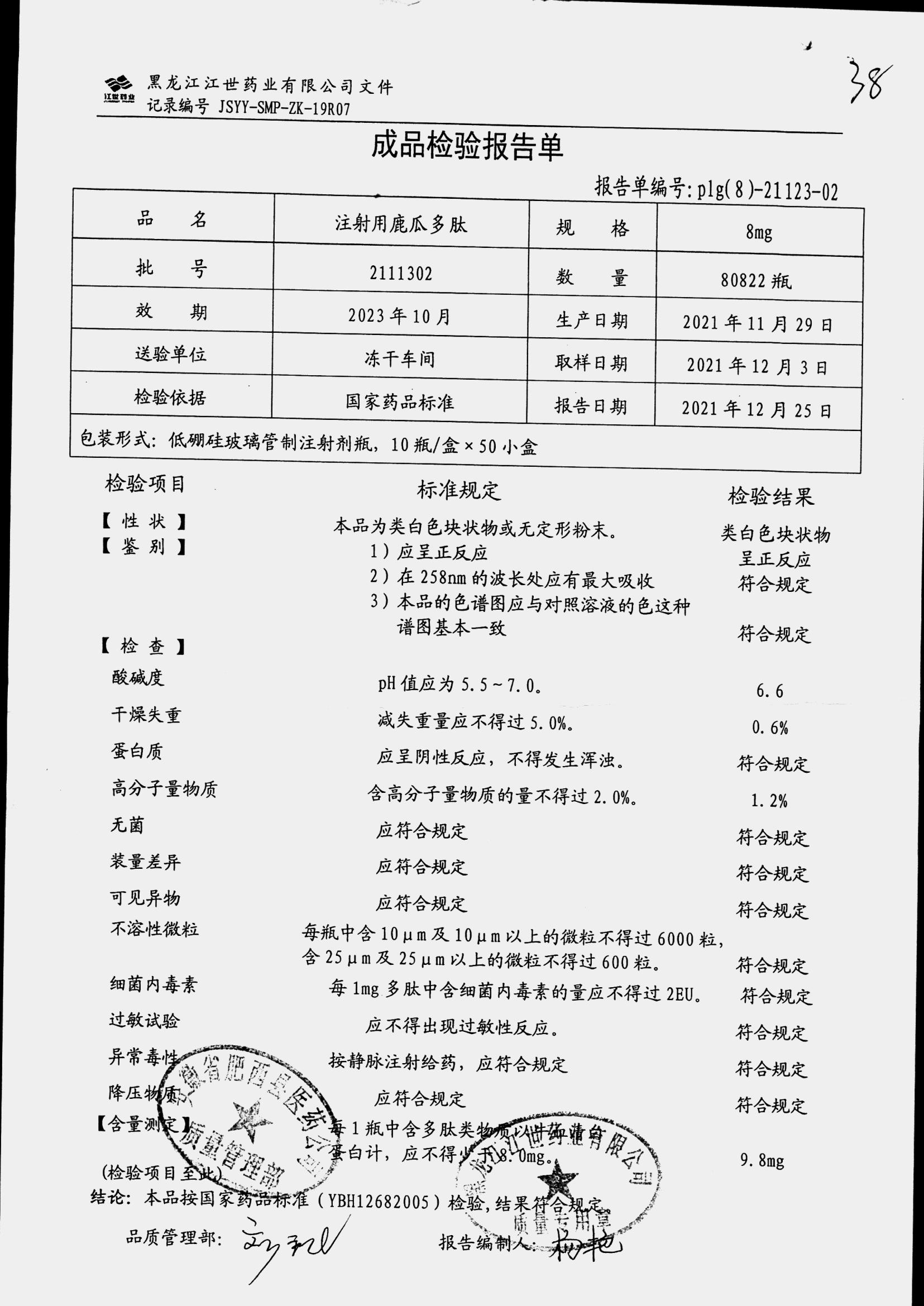 | 注射用鹿瓜多肽 | 8mg | 2111302-2 | 查看詳情 |