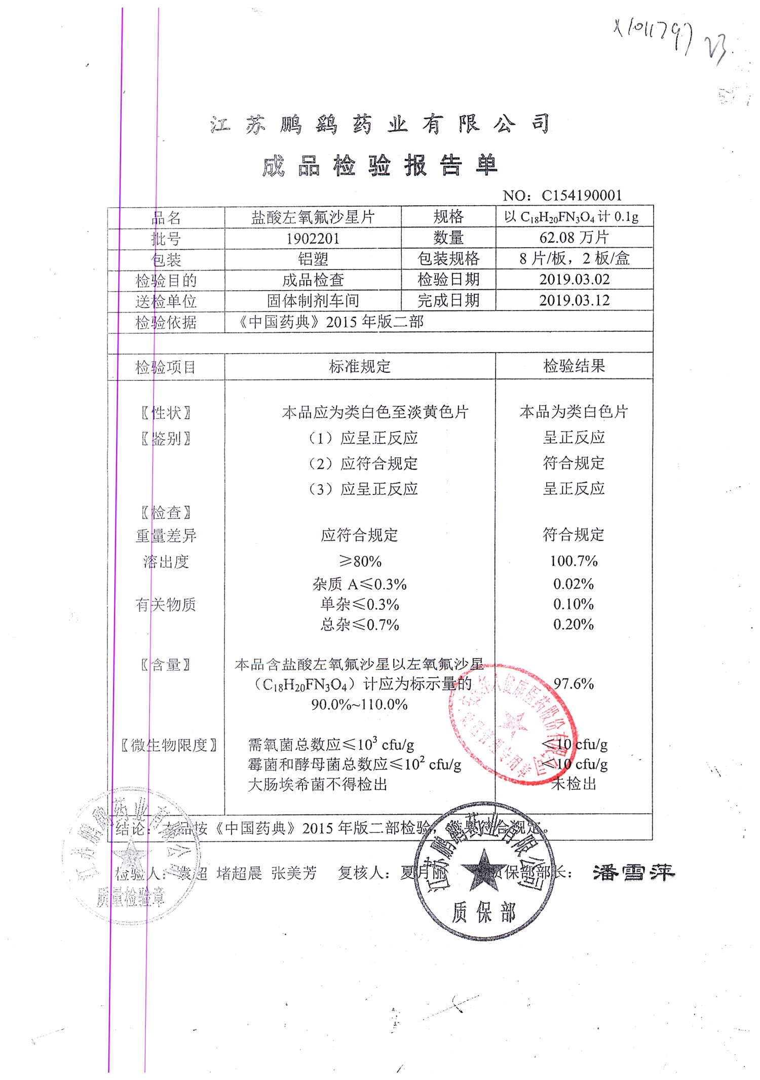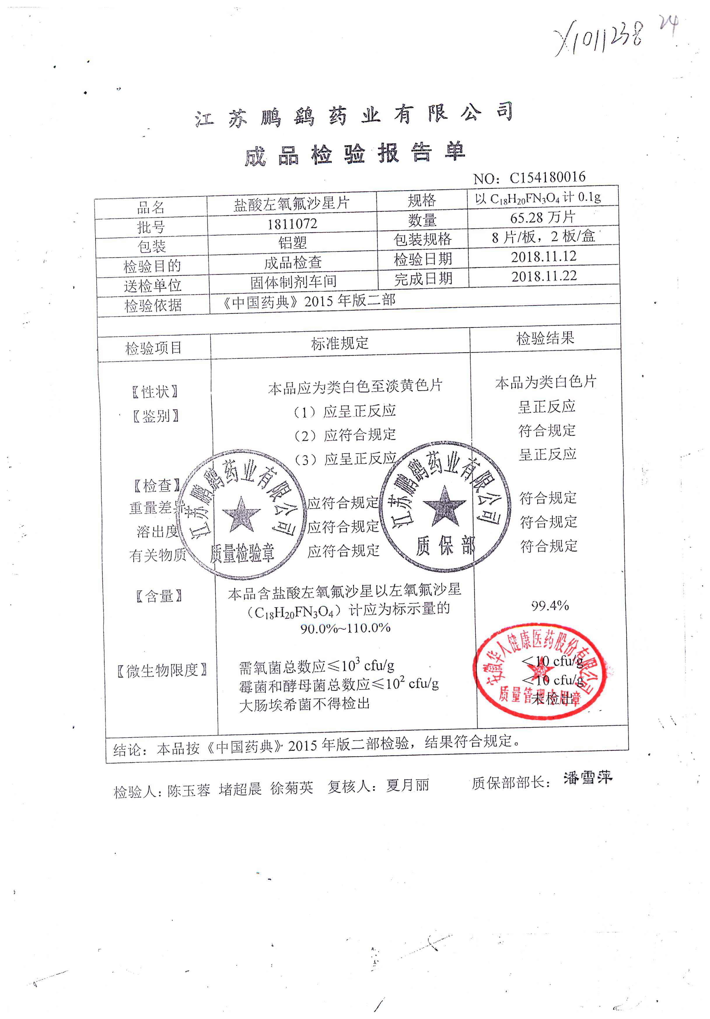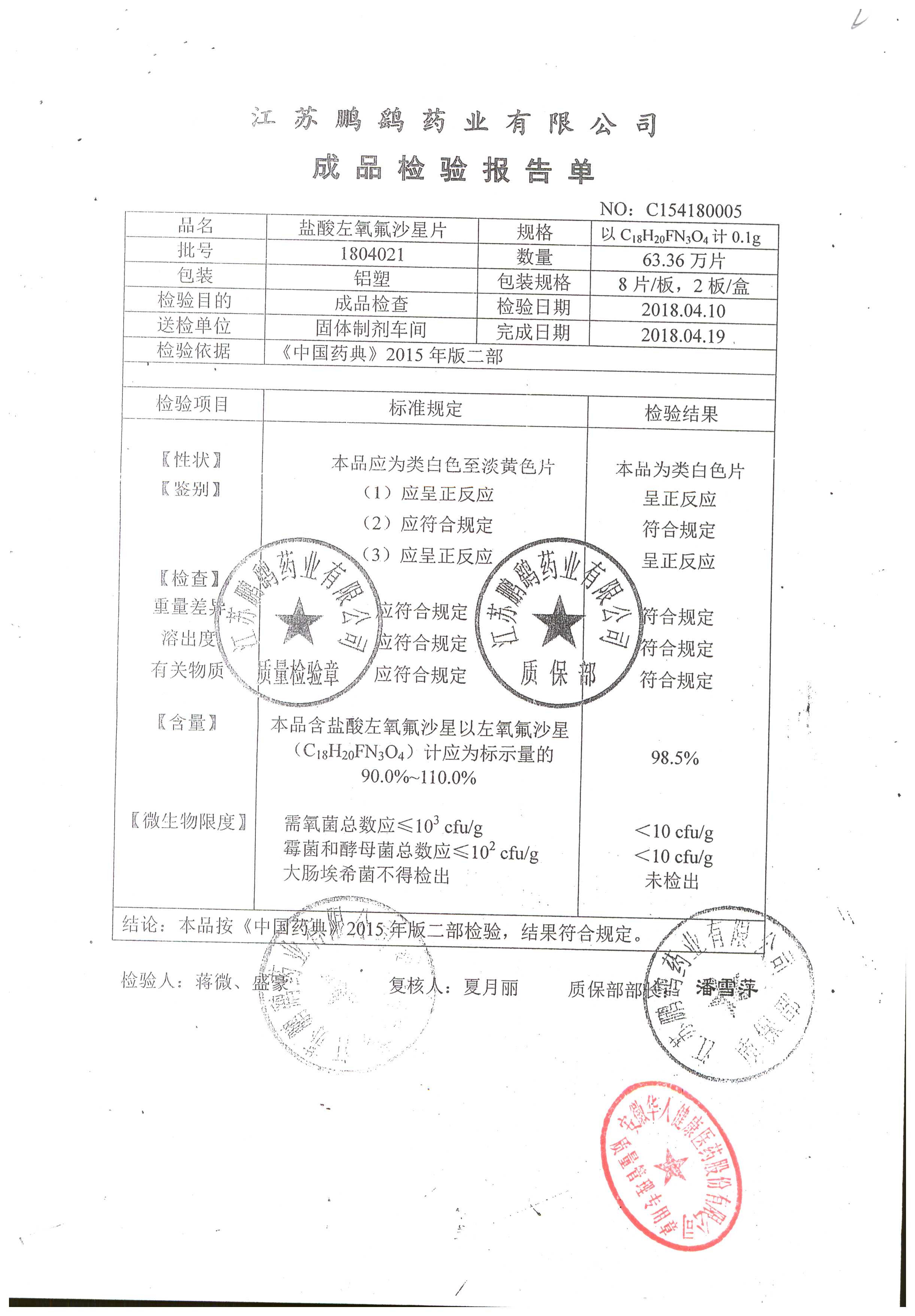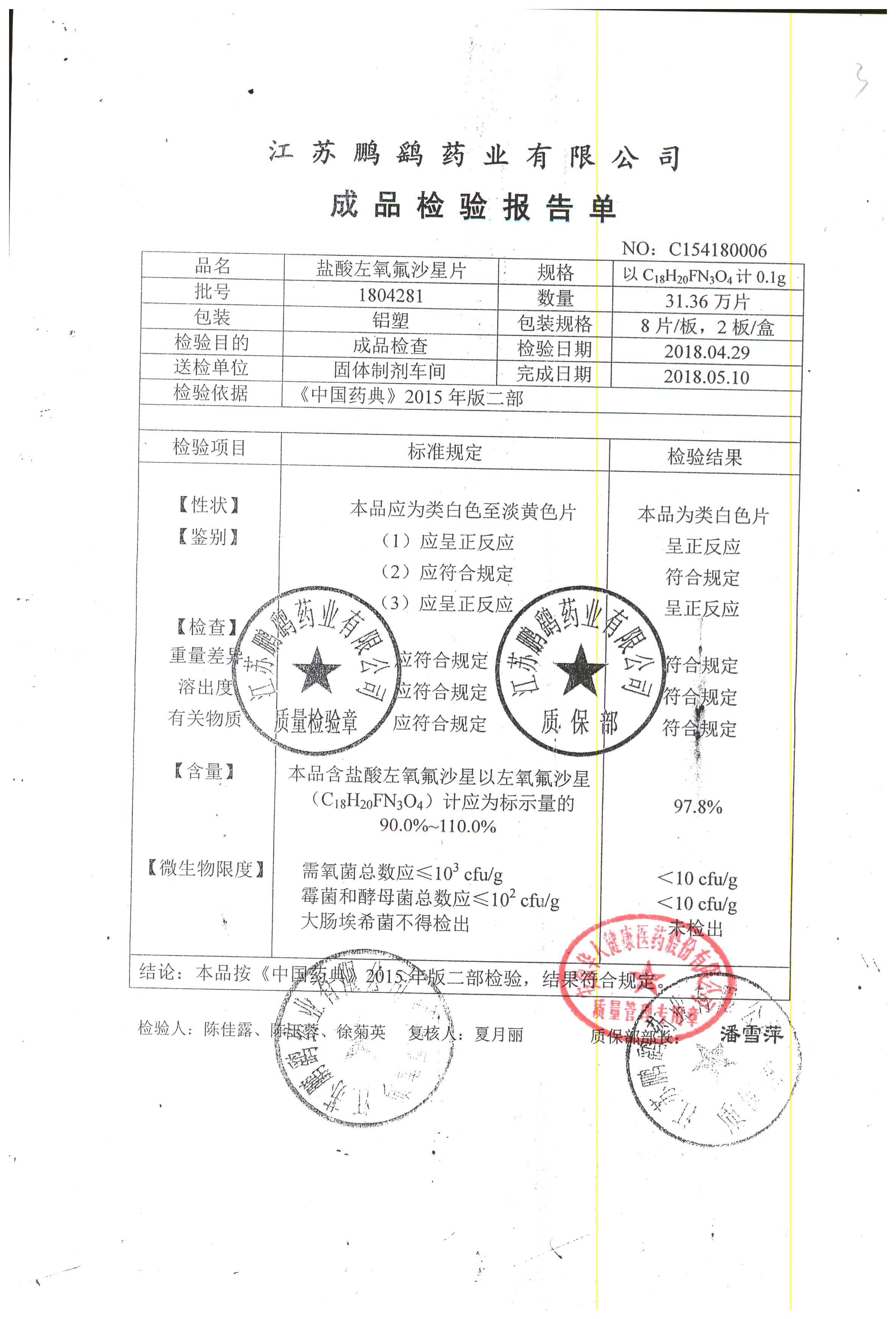 鹽酸左氧氟沙星片 16s 1803051 查看詳情