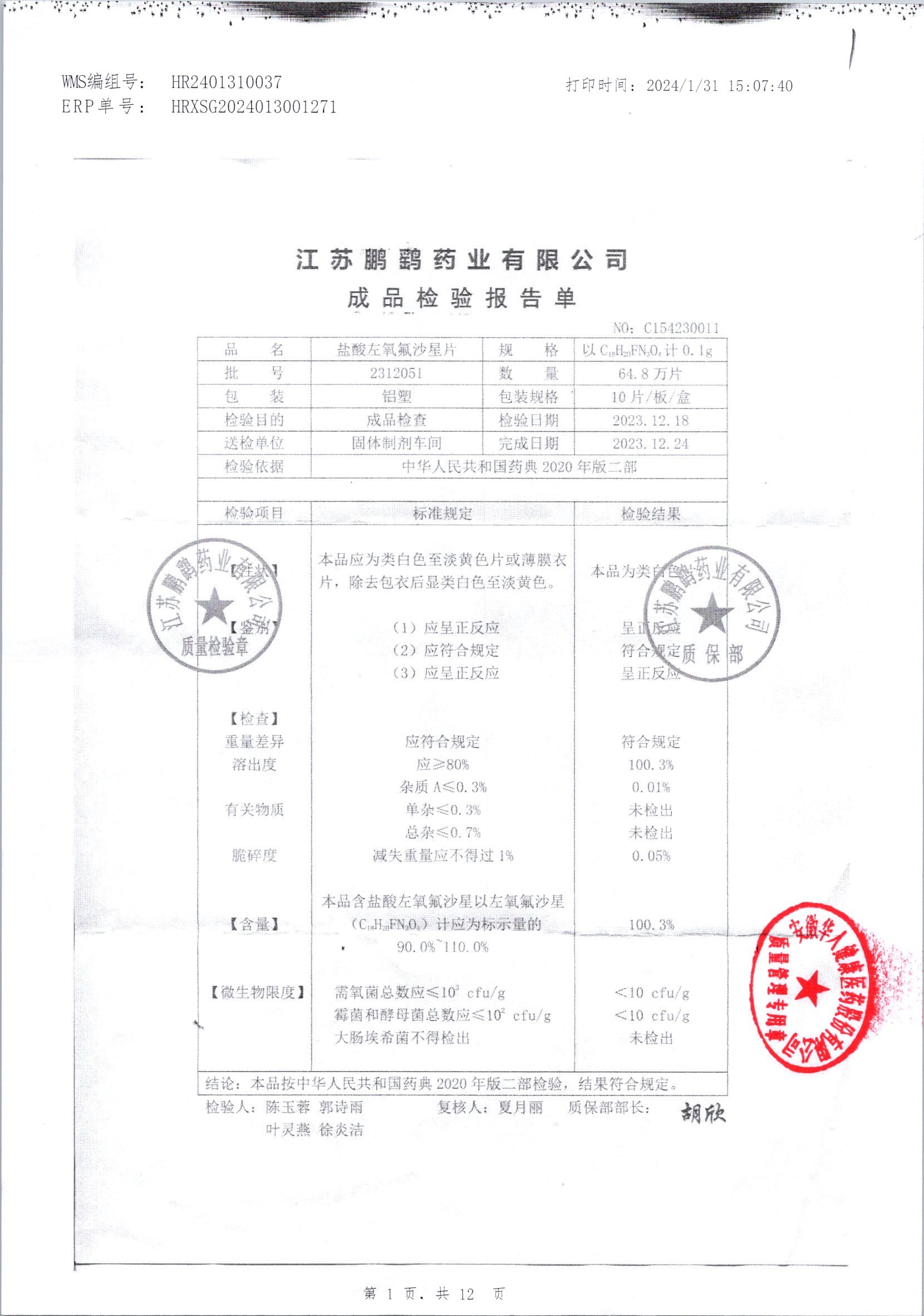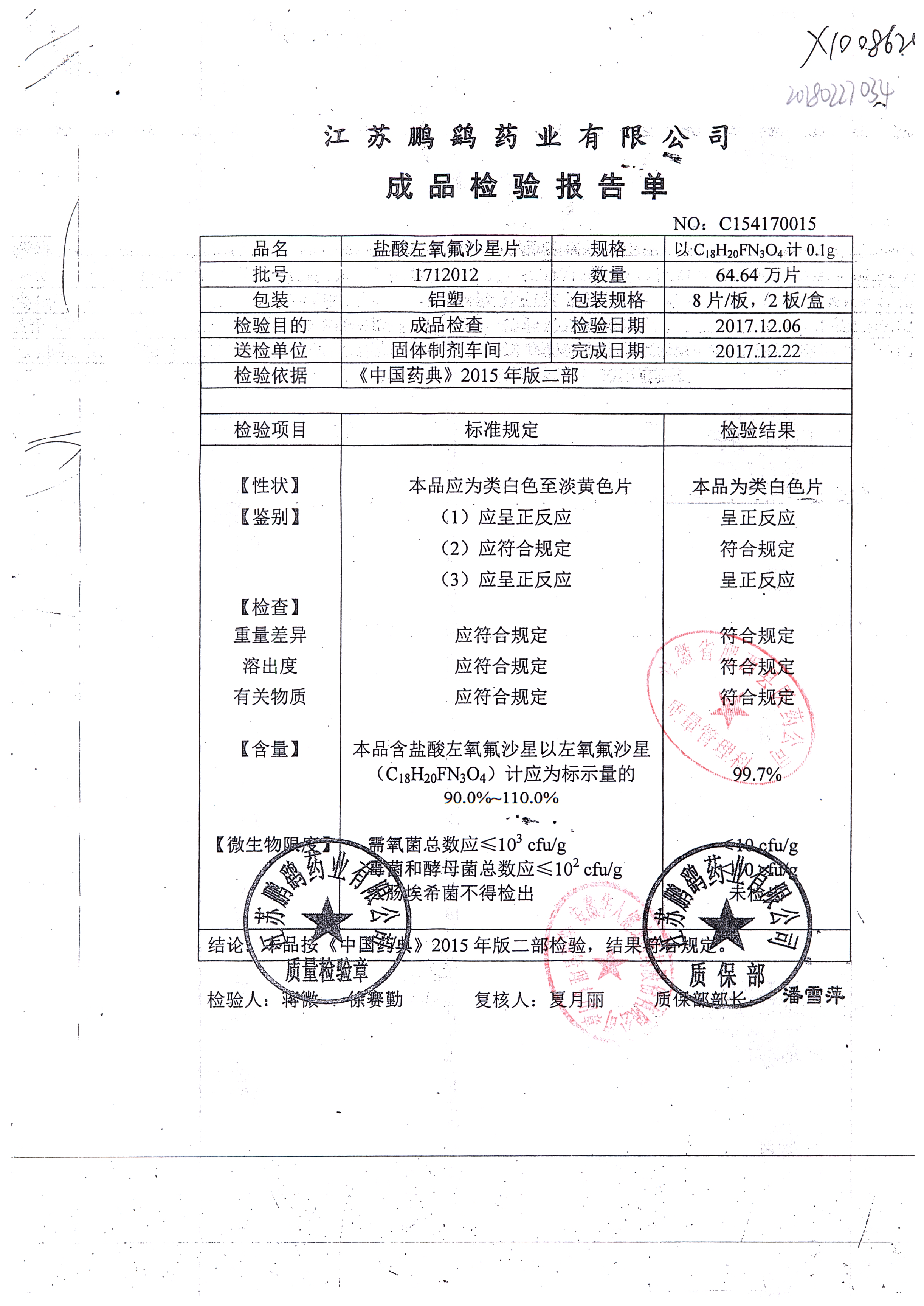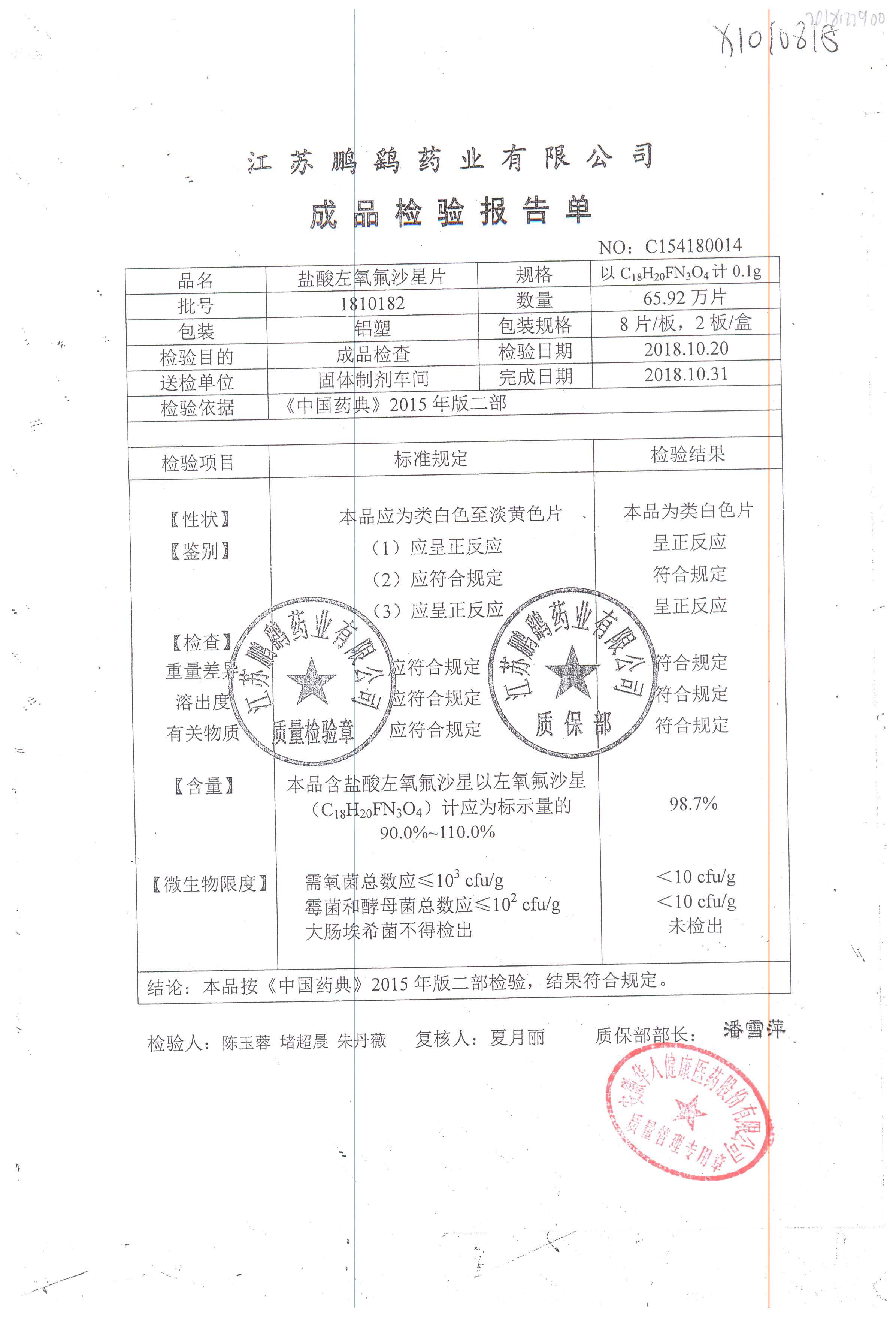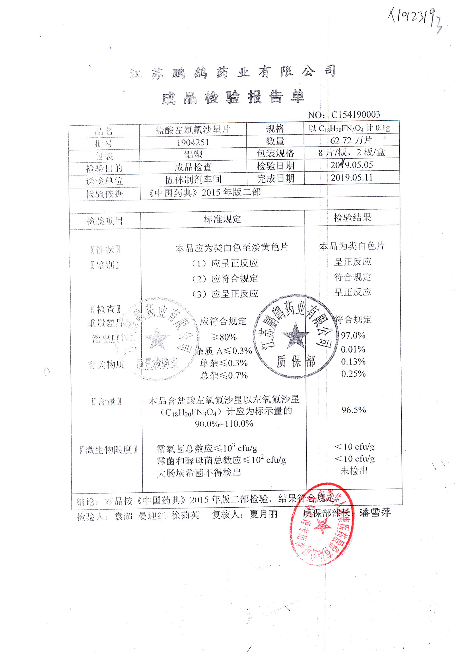 鹽酸左氧氟沙星片 16s 1803051 查看詳情