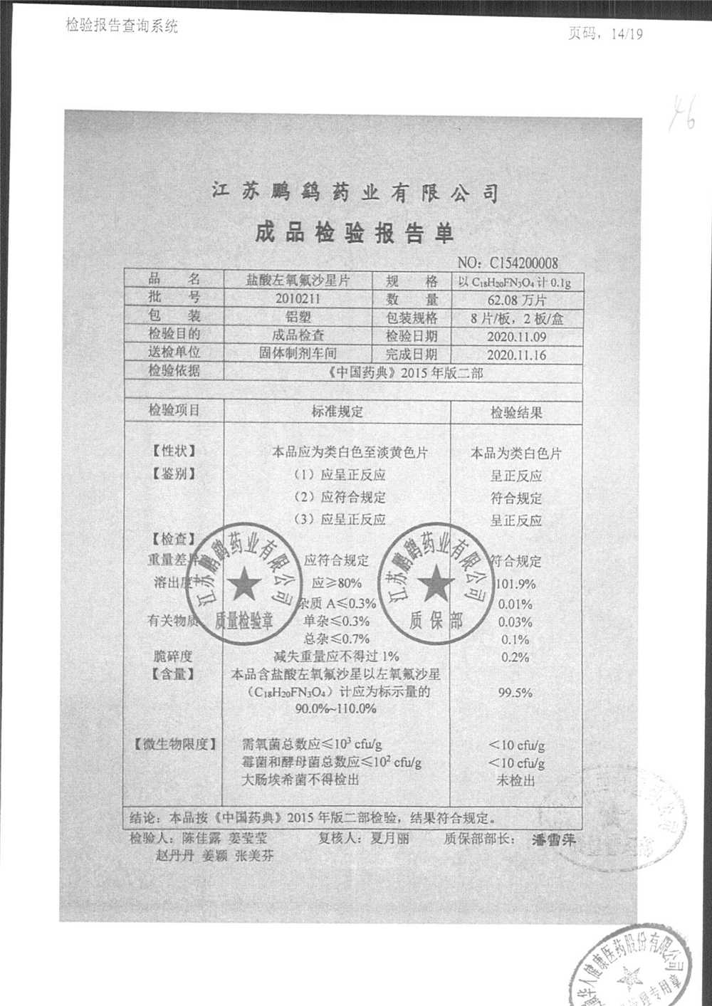 鹽酸左氧氟沙星片 16s 2010211 查看詳情