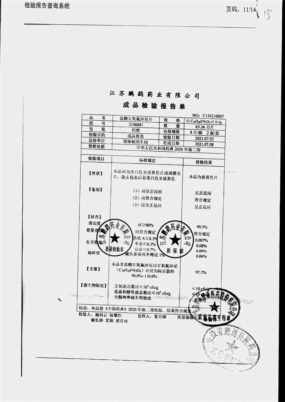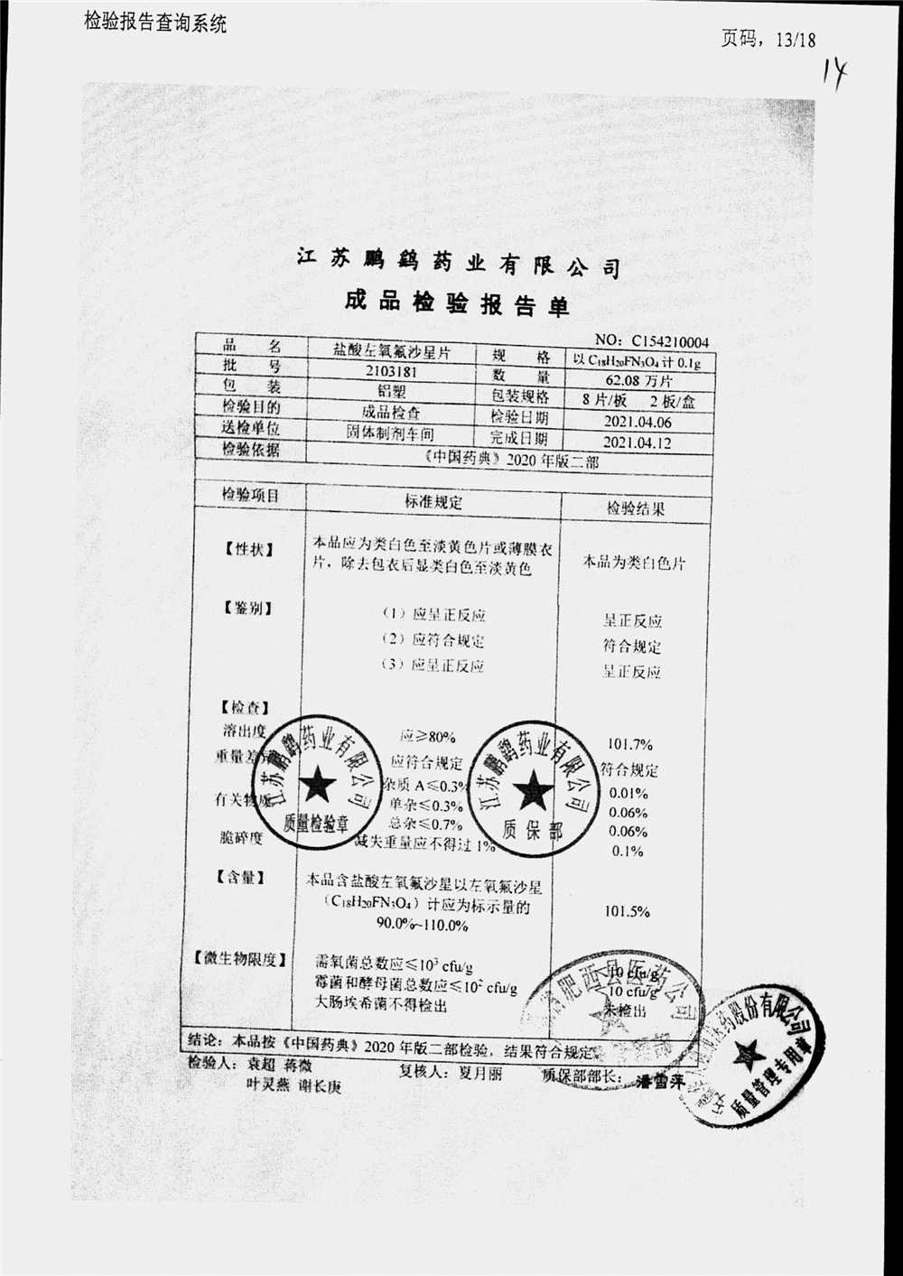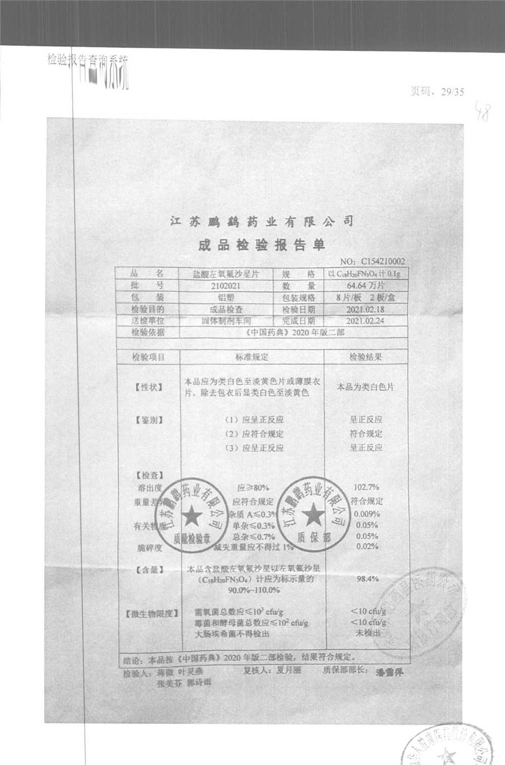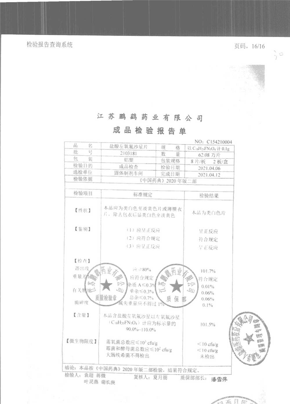 鹽酸左氧氟沙星片 16s 2102021 查看詳情
