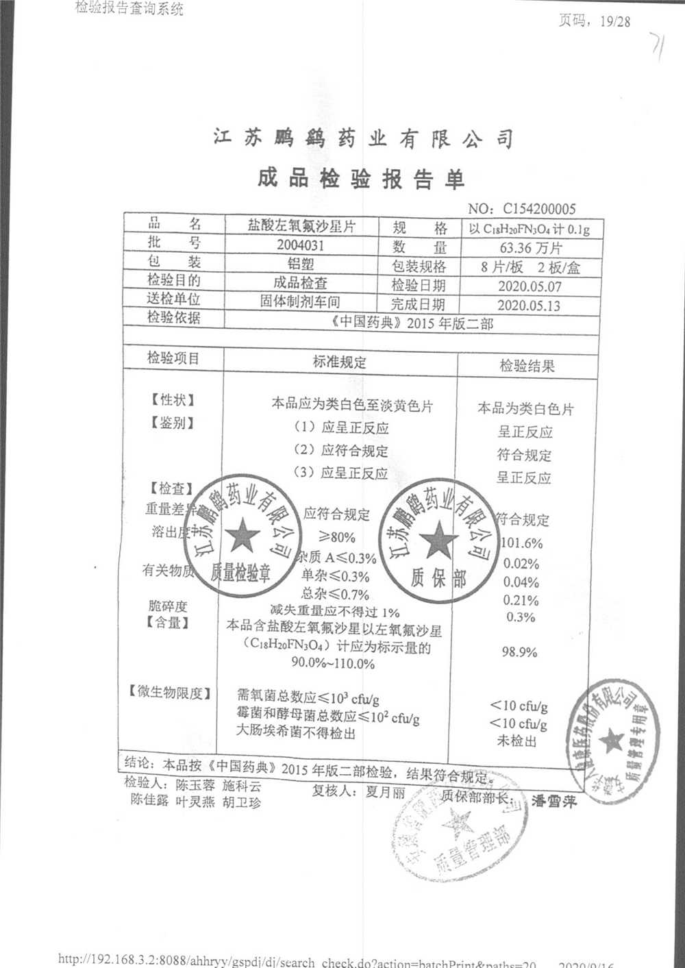 鹽酸左氧氟沙星片 16s 1804021 查看詳情