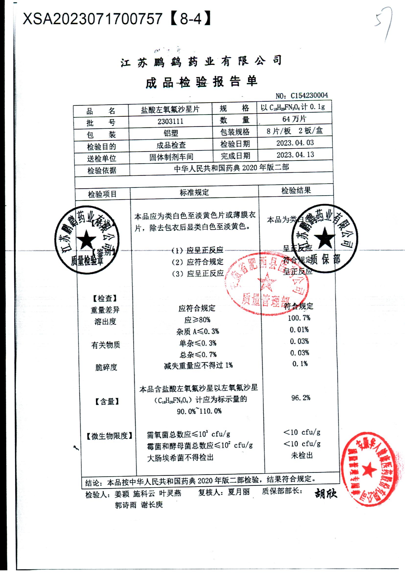 鹽酸左氧氟沙星片 16s 2312051 查看詳情